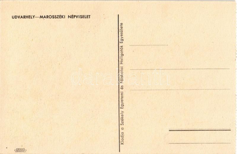 Udvarhelyszék, Scaunul Odorhei; Marosszéki népviselet. Kiadja a Székely Egyetemi és Főiskolai Hallgatók Egyesülete, képeslapfüzetből / Transylvanian folklore, from a postcard booklet s: Szilágyi J.
