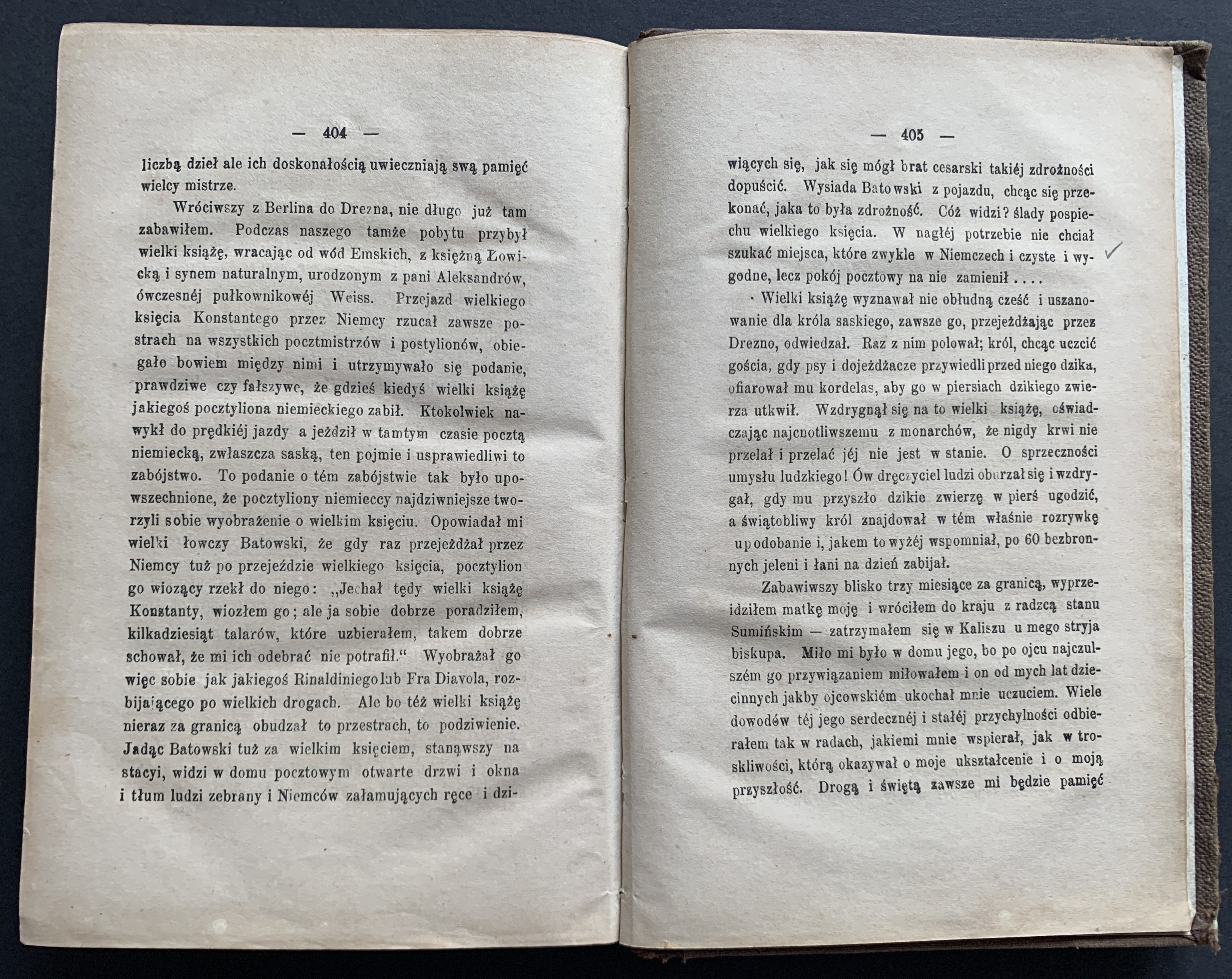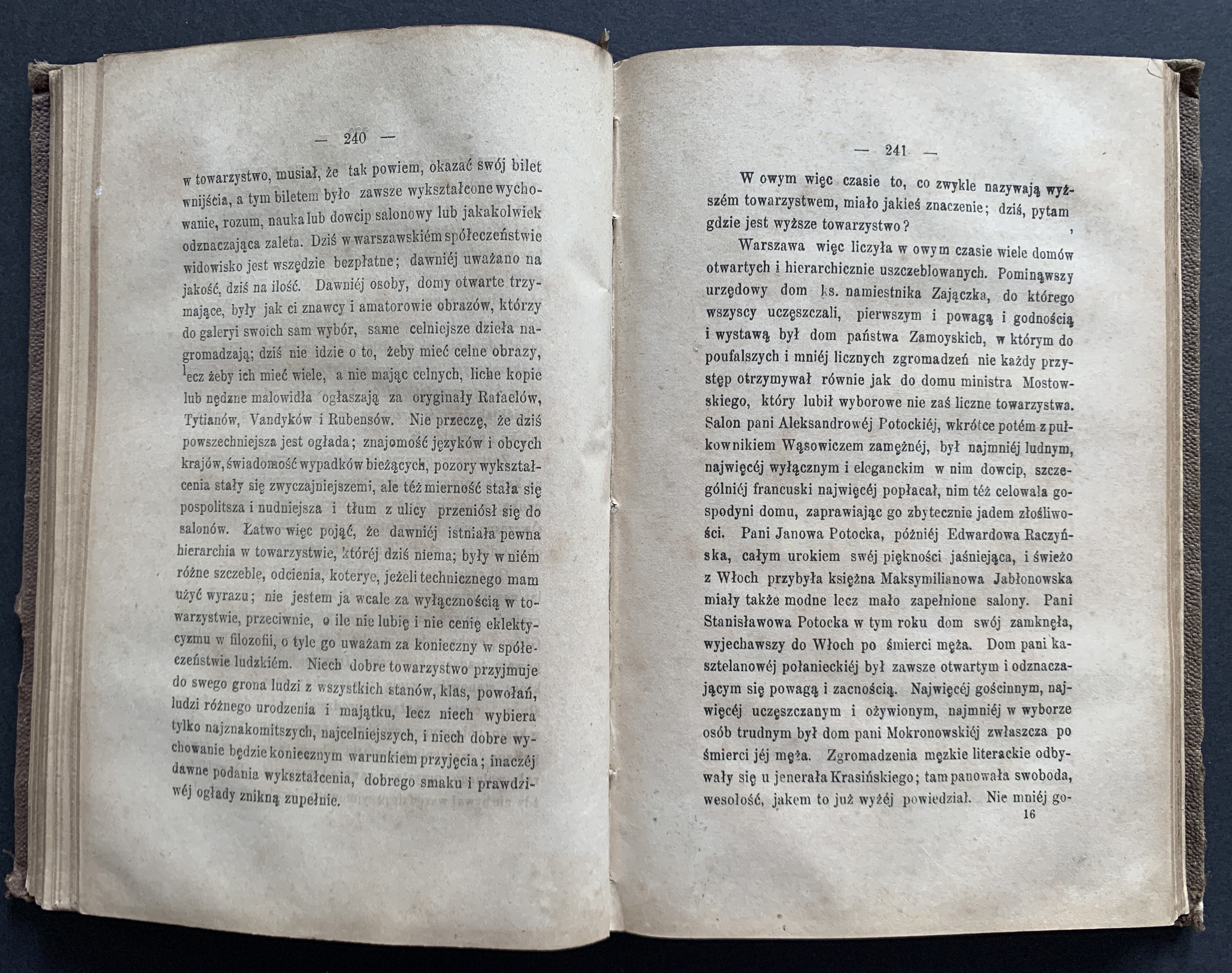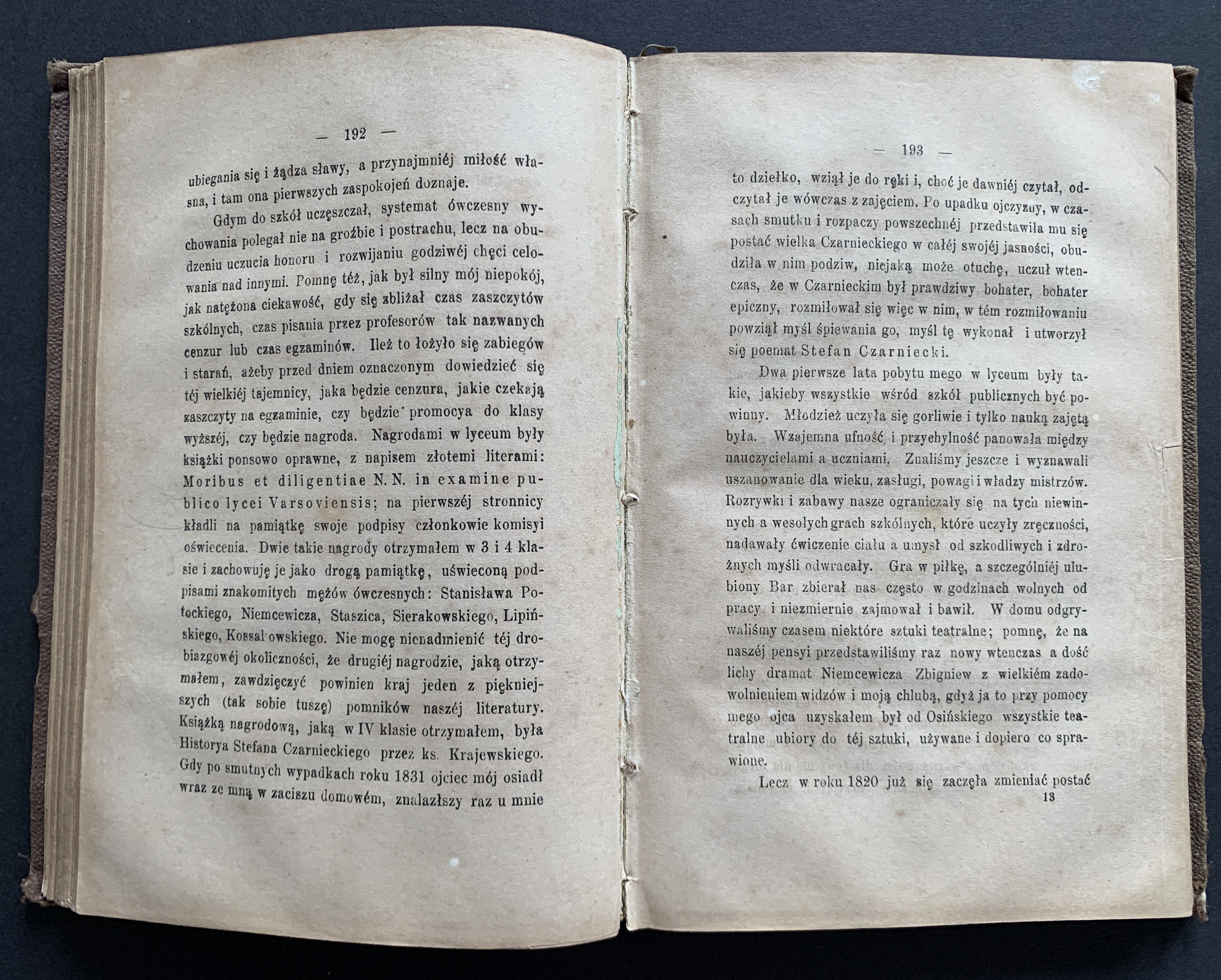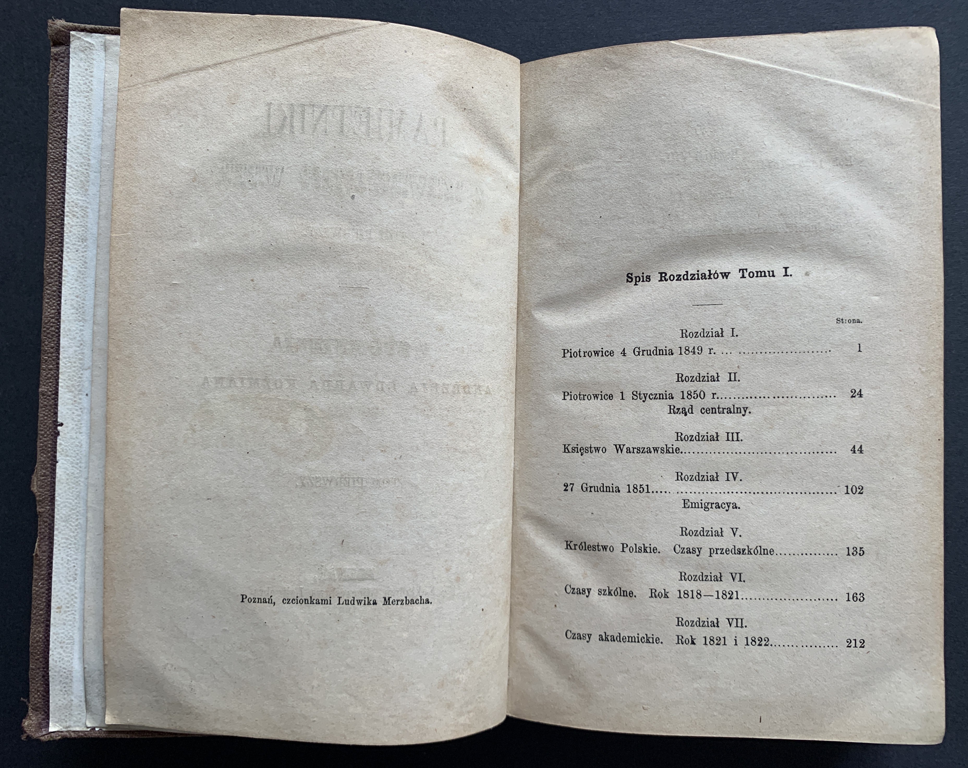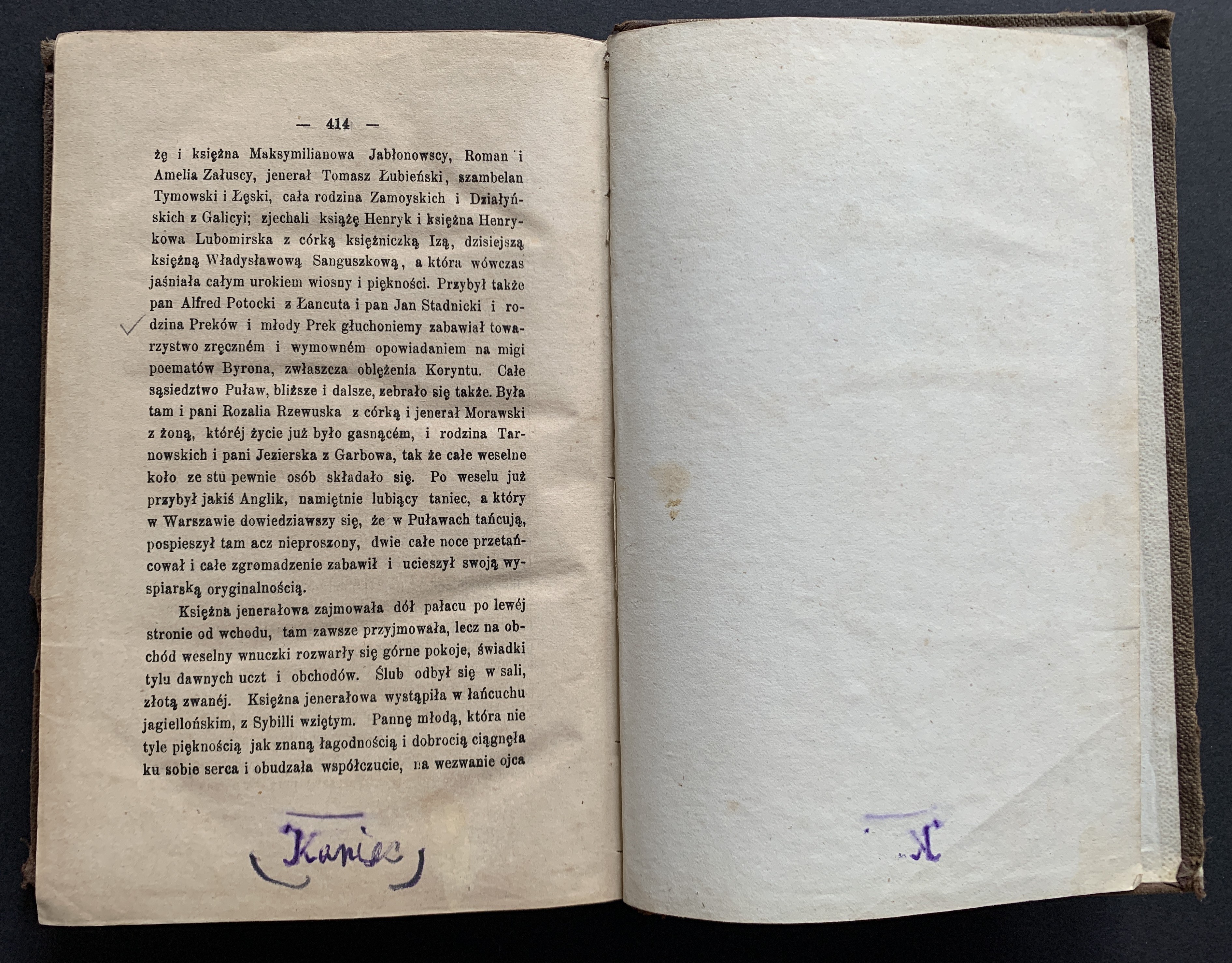 Format:21cm. Stron:VI, [2], 414 [zamiast 418]. Oprawa wtórna: psk z epoki, złocone napisy na grzbiecie. Destrukt: brak s. 415 – 418. U dołu str. 414 właściciel dopisał „Koniec”.