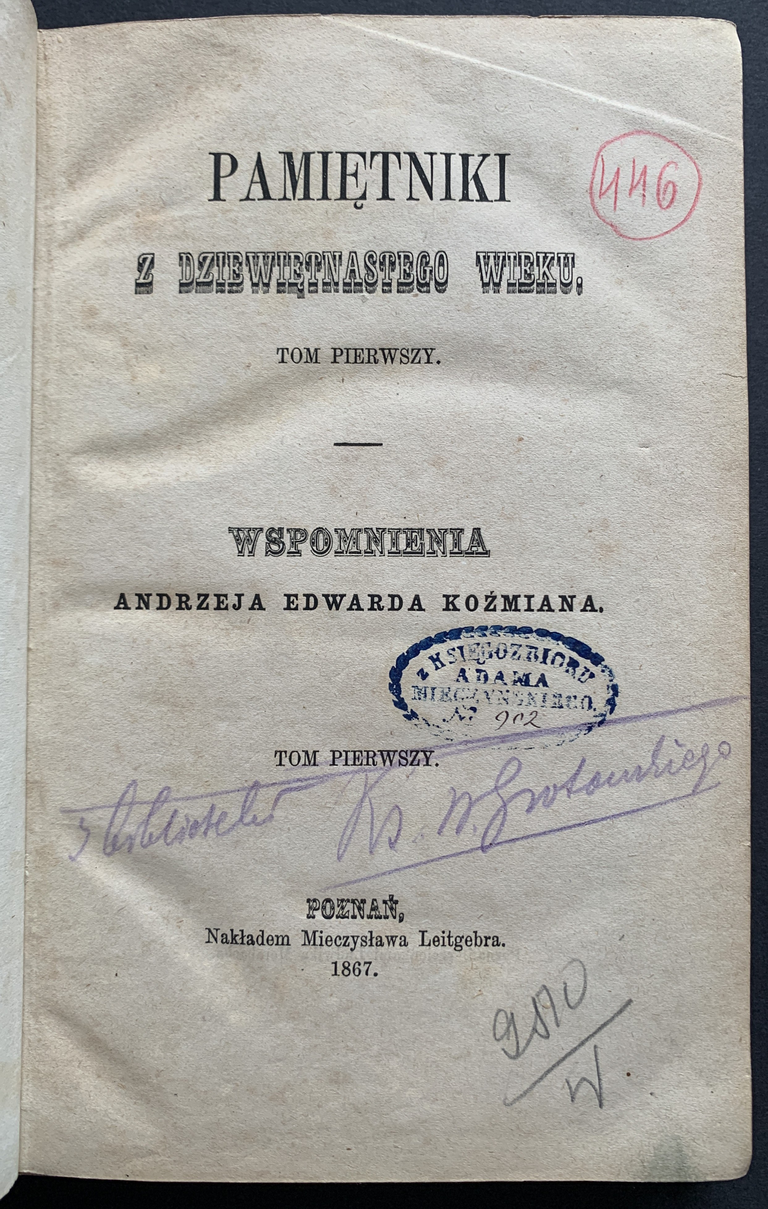 KOŹMIAN Andrzej Edward – Wspomnienia. Tom pierwszy [z dwóch]. Poznań 1867. Nakładem Mieczysława Leitgebra. Na k. tytułowej: Pamiętniki z dziewiętnastego wieku. Tom pierwszy.