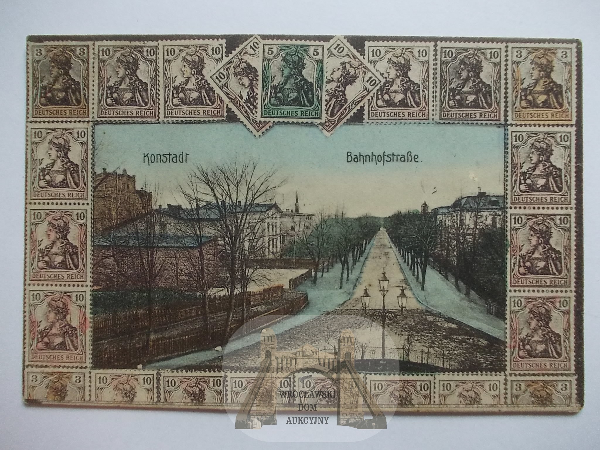 Wołczyn, Konstadt k. Kluczbork, ul. Dworcowa, znaczki, kolaż, 1927