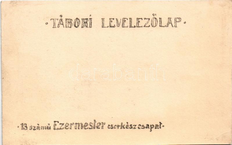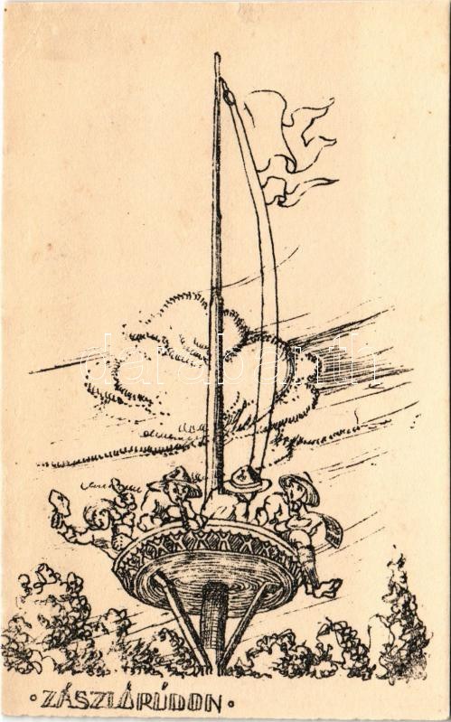 Zászlórúdon. 13. számú Ezermester cserkészcsapat Tábori levelezőlap / Hungarian boy scout art postcard (felületi sérülés / surface damage)