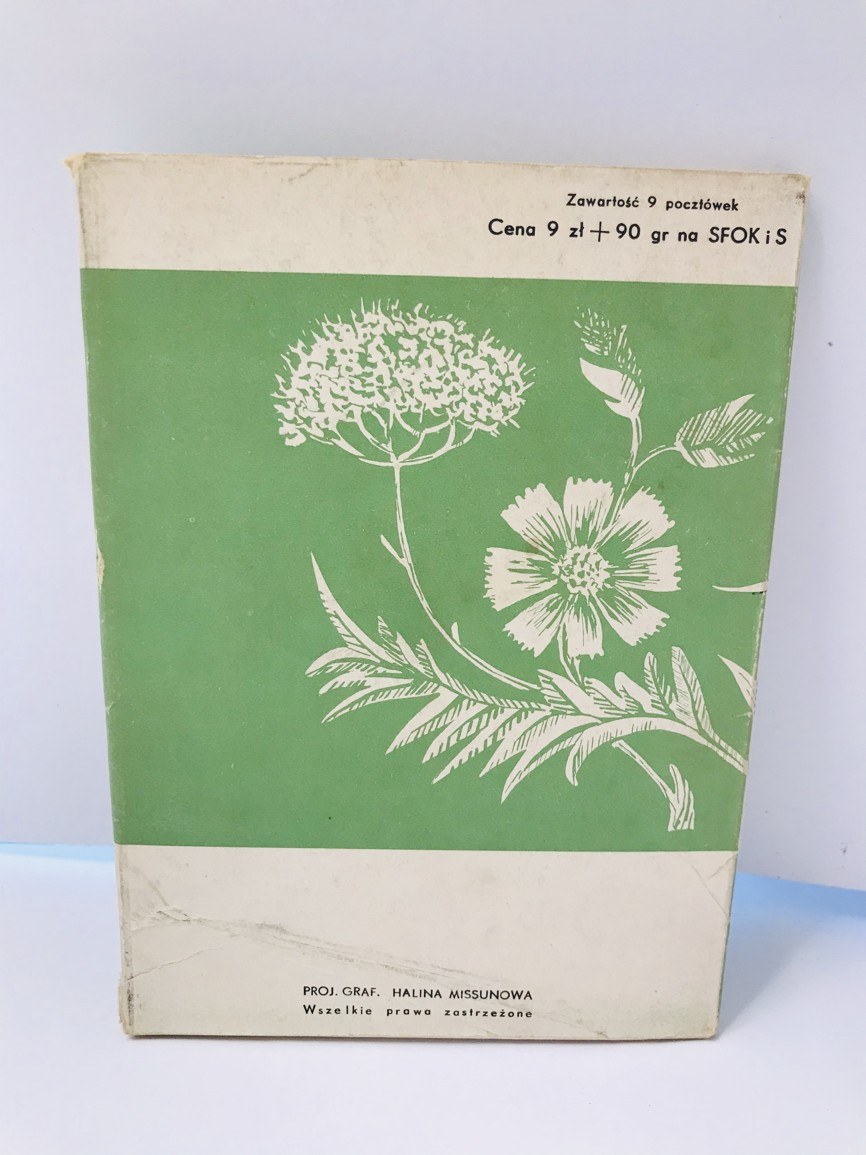 Zestaw pocztówek z serii Rośliny pospolite, Biuro Wydawnicze „Ruch”, Warszawa ok. 1962, w. 15 x 10,5 cm. 9 pocztówek (komplet) wg projektów graficznych Haliny Missunowej w przybrudzonej, lekko podniszczonej obwolucie.