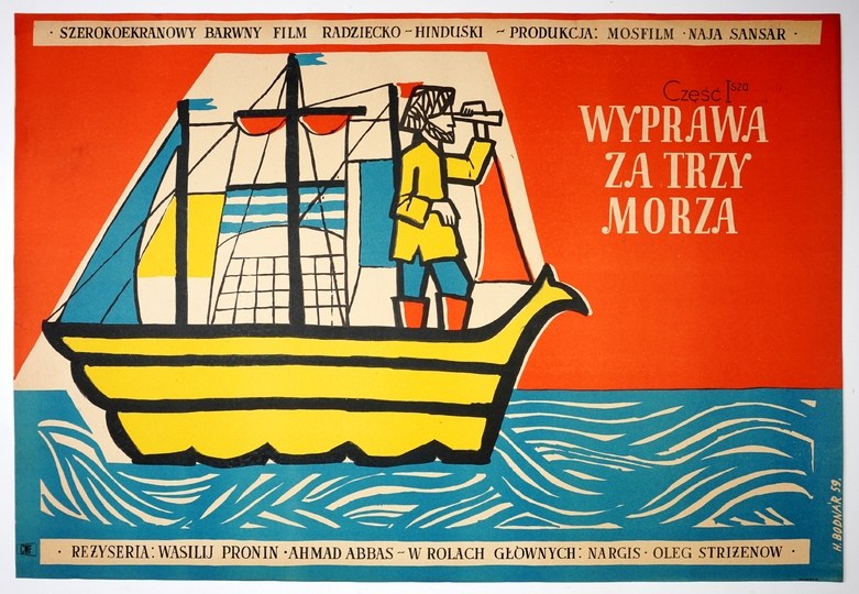 Plakat filmowy form. 58,3x85 cm. Żaglowiec na morzu, na nim kapitan wypatrujący stałego lądu. Film radziecko-hinduski (oryg. "Pardesi"). Reż. W. Pronin. Wyst. Nargis, O. Striżenow. Plakat do cz. 2 wykorzystywał tę samą kompozycję wydrukowaną w odmiennej kolorystyce. Stan dobry.
