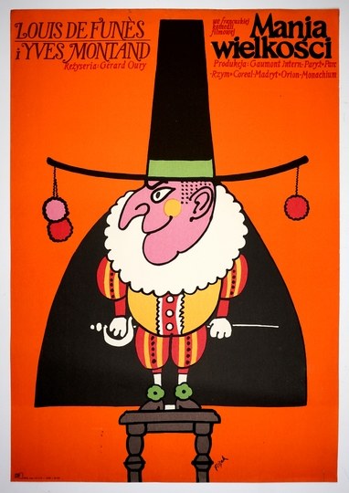 MPP MŚ 86. Plakat filmowy form. 84x58,4 cm. Główny bohater - królewski poborca podatkowy - stojący na ozdobnym taborecie. Komedia francuska (oryg. "La folie des grandeurs"). Reż. G. Oury. Wyst. L. de Funes, Y. Montand. Podklejone niewielkie naddarcia krawędzi.
