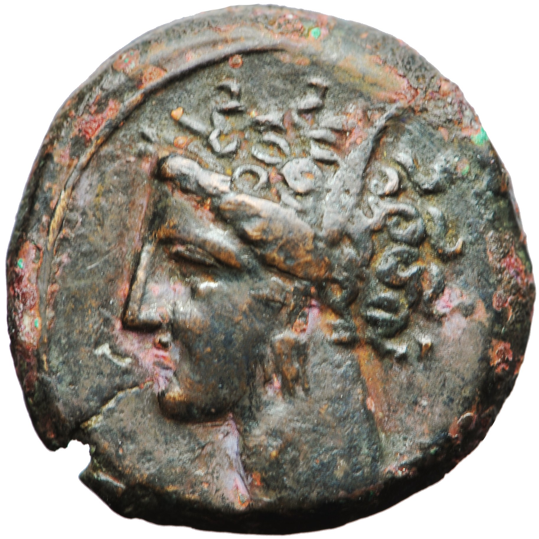 Obv. Head of Tanit to the left, wearing a wreath of grain ears.