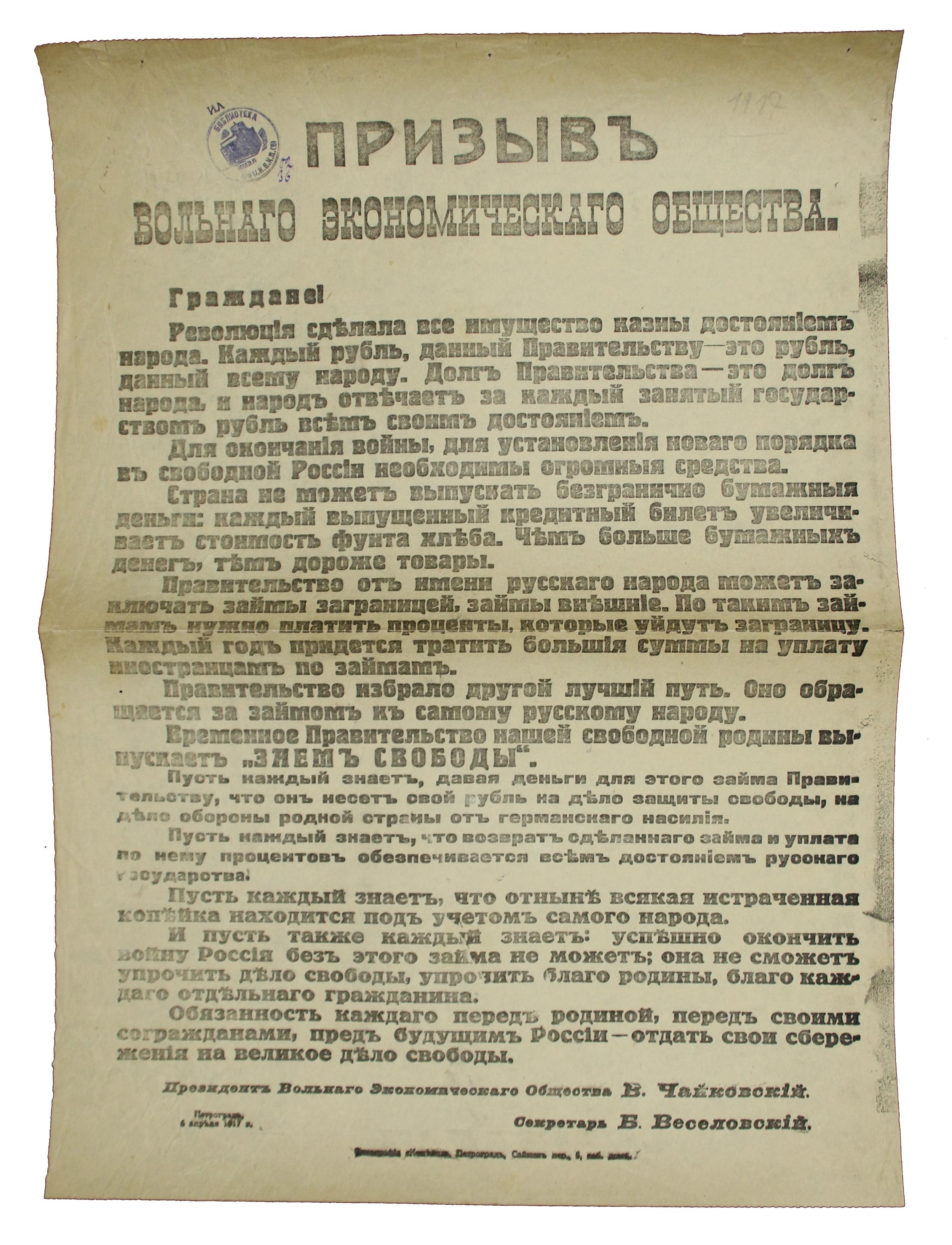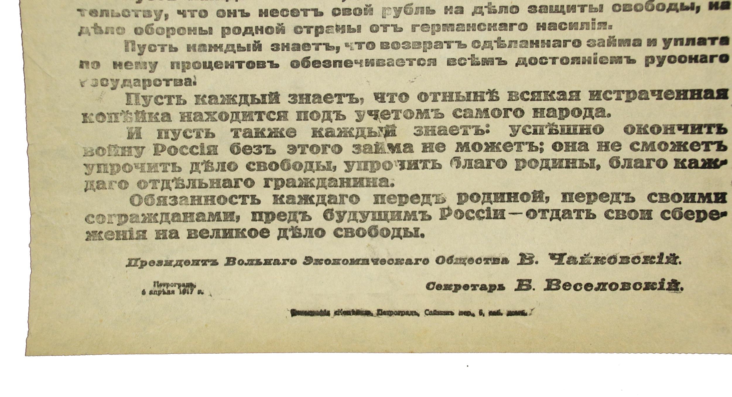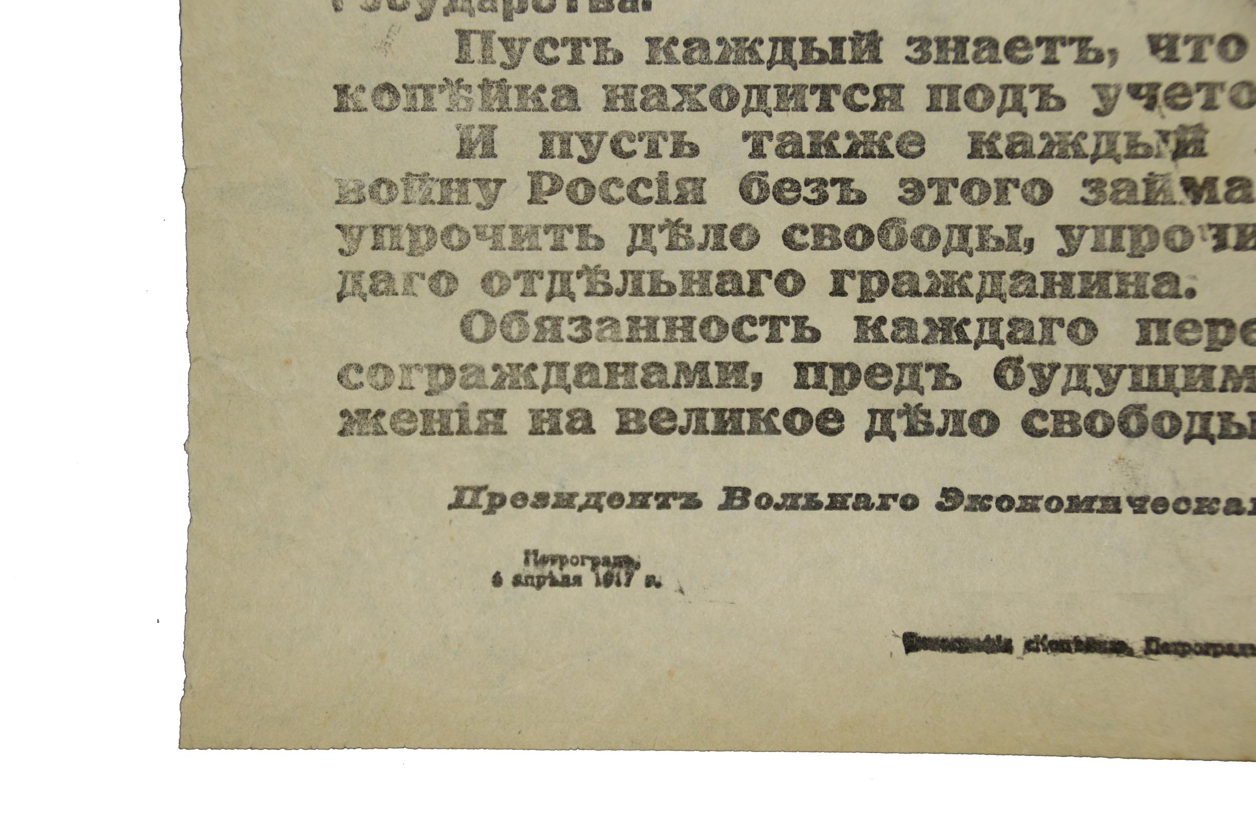Afisz rosyjski- wezwanie do składania kosztowności na rzecz walki rewolucyjnej, Piotrogród, kwiecień 1917r. Wym. 41 x 29 cm.