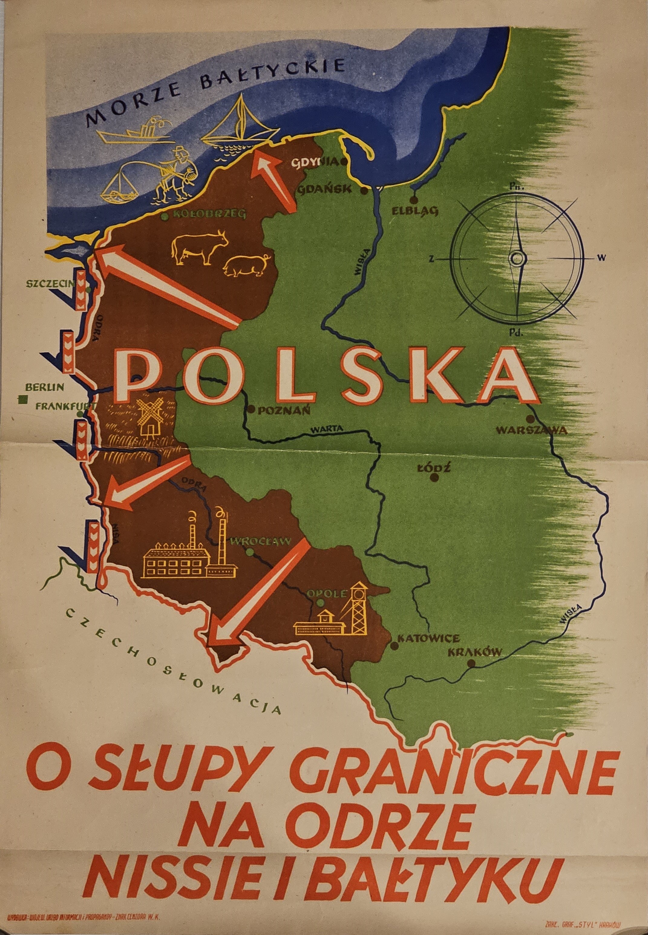 Kraków, Wydawca: Wojew. Urząd Informacji i Propagandy. Zakł. Graf. "Styl" Kraków, b. r. [1945]. Offset barwny, niesygn., wym.: 63 x 42.5 cm, poza śladem złożenia, stan bardzo dobry.