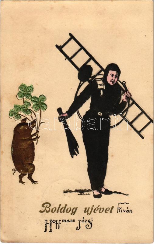 1900 Boldog újévet! Dombornyomott üdvözlet kéményseprővel és malaccal / New Year embossed greeting...
