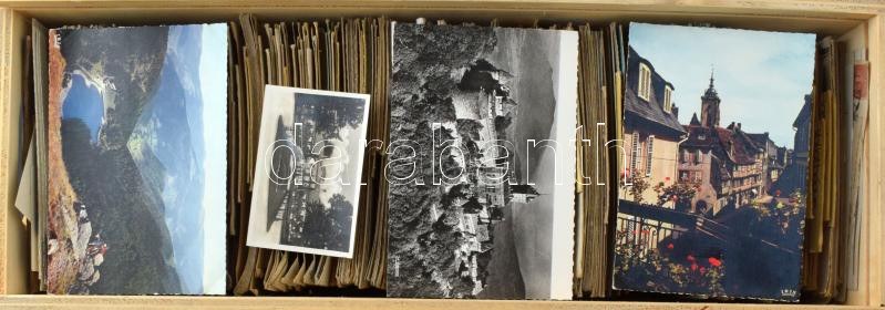 Kb. 920 db főleg RÉGI francia képeslap dobozban, vegyes minőség, válogatott anyag / Cca. 920 mostly pre-1960 French postcards in a box, mixed quality, selected