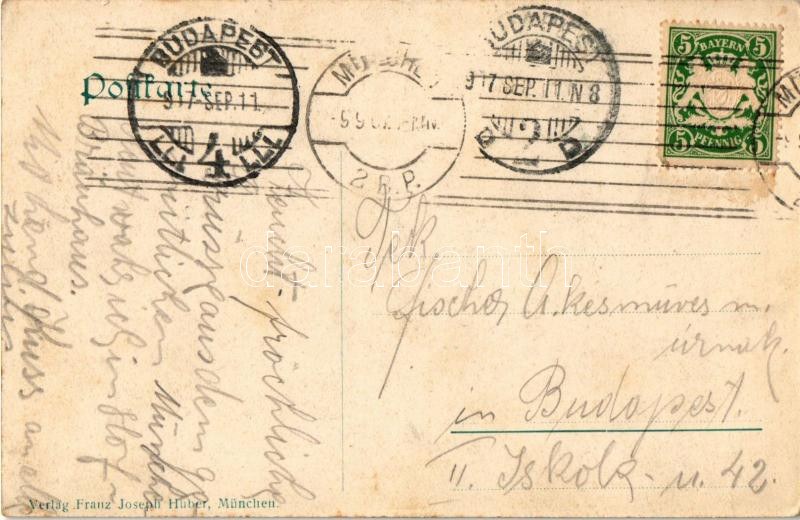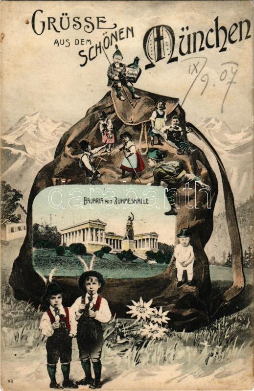1917 München, Munich; Bavaria mit Ruhmeshalle. Verlag Franz Joseph Huber / montage with backpack and hiking children (fl)