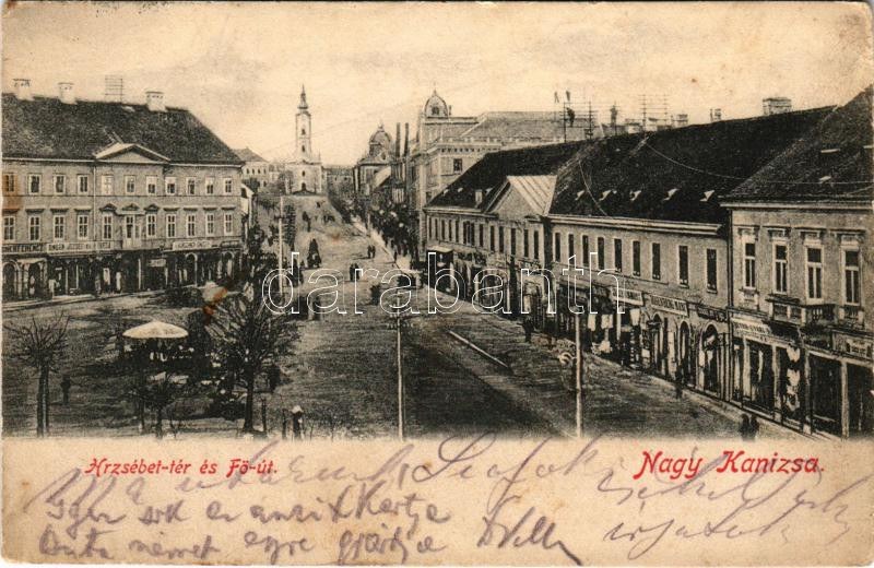 1905 Nagykanizsa, Erzsébet tér és Fő út, piac, Singer József és társa és Rosenberg Manó üzlete (EK...