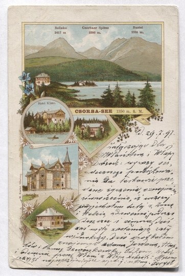 Tatarczuch 21. M. Kuschel, Silberberg. Główny widok: Jezioro Szczyrbskie, poniżej cztery mniejsze z charakterystyczną dla okolicy zabudową. Z korespondencją i znaczkiem. Data stempla: 1 VIII 1897. Niewielkie otarcia.
