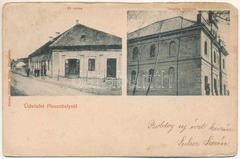 Pincehely (Tolna), Fő utca, üzlet, Izraelita templom, zsinagóga. Grünhut Miksa kiadása (EM)