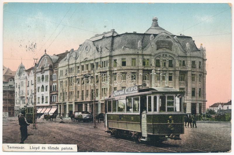 1913 Temesvár, Timisoara; Lloyd palota és tőzsde, villamos Turul Cipő reklámmal. Moravetz Testvérek kiadása / palace...