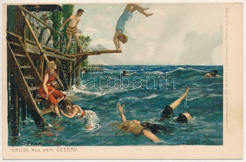 Gruss aus dem Seebad. Kuenstlerpostkarte No. 1696. von Ottmar Zieher / Strandolás / sport on the beach. Art Nouveau litho s: Zeno Diemer