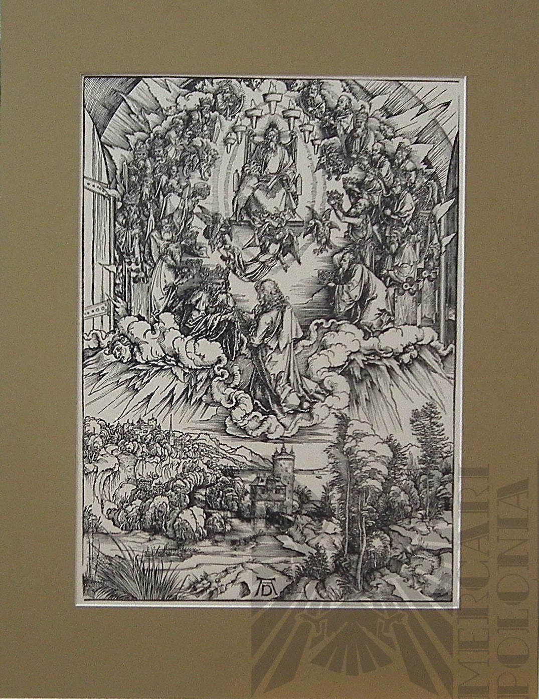 Pośrodku, z profilu, można zobaczyć św. Jana w geście modlitwy, patrzącego na Boga. Jest on świadkiem tej wizji, co jest kluczowym tematem serii. W górnej części kompozycji drzeworytu Bóg siedzi na tronie, a Jego majestat podkreślają szczegóły płaszcza oraz korony. Starsi otaczają tron Boga, trzymając złote korony. Symbolizują oni sprawiedliwość i mądrość oraz oddają Bogu chwałę. W górnych częściach kompozycji widać aniołów unoszących się wokół tronu, co wzmacnia metafizyczny wymiar sceny.Drzeworyty Dürera wyróżniają się niezwykłą precyzją i misternym detalem, co jest widoczne również w tej pracy. Zastosowanie perspektywy, światłocienia i ornamentyki sprawia, że scena zyskuje na dynamice i dramaturgii.Drzeworyt nie tylko wiernie ilustruje biblijne fragmenty, ale również wyraża eschatologiczne lęki i nadzieje ludzi epoki renesansu. Seria „Apokalipsa” była odpowiedzią na niepokoje związane z końcem XV wieku, gdy wielu ludzi obawiało się nadchodzącego końca świata, co miało swoje odzwierciedlenie w sztuce i literaturze tamtego okresu.Dzieło Dürera to nie tylko ilustracja religijna, ale także świadectwo jego mistrzowskich umiejętności w technice drzeworytu, precyzyjnej obserwacji i głębokiego zrozumienia symboliki biblijnej.