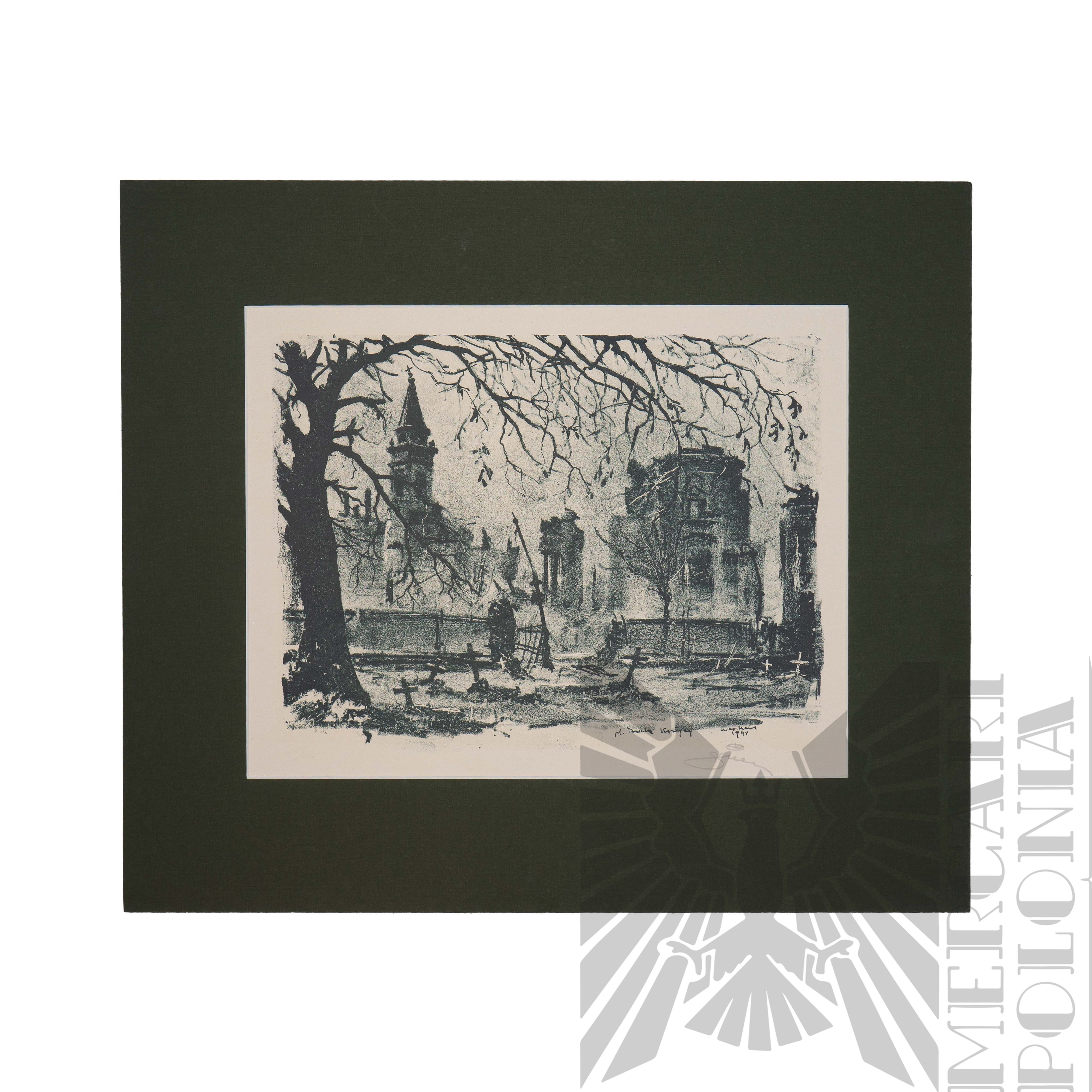 autolitografia, papier, 26 x 34 cm w świetle passe-partout, wymiary zewnętrzne 41 x 48 cm, sygnowana ołówkiem przez autora p.d. oraz opisana i datowana na płycie. Nakład 300 egz. Warszawa 1945