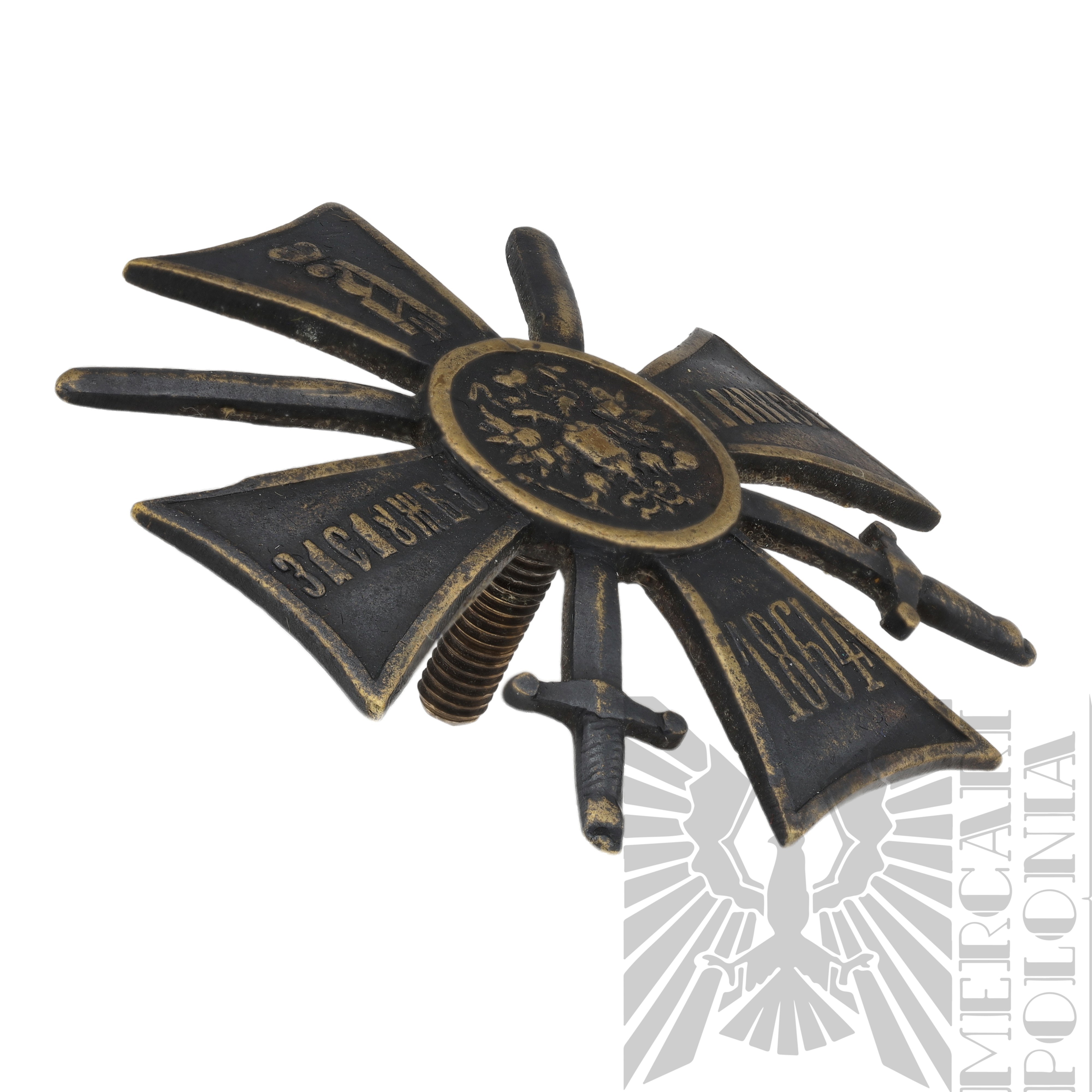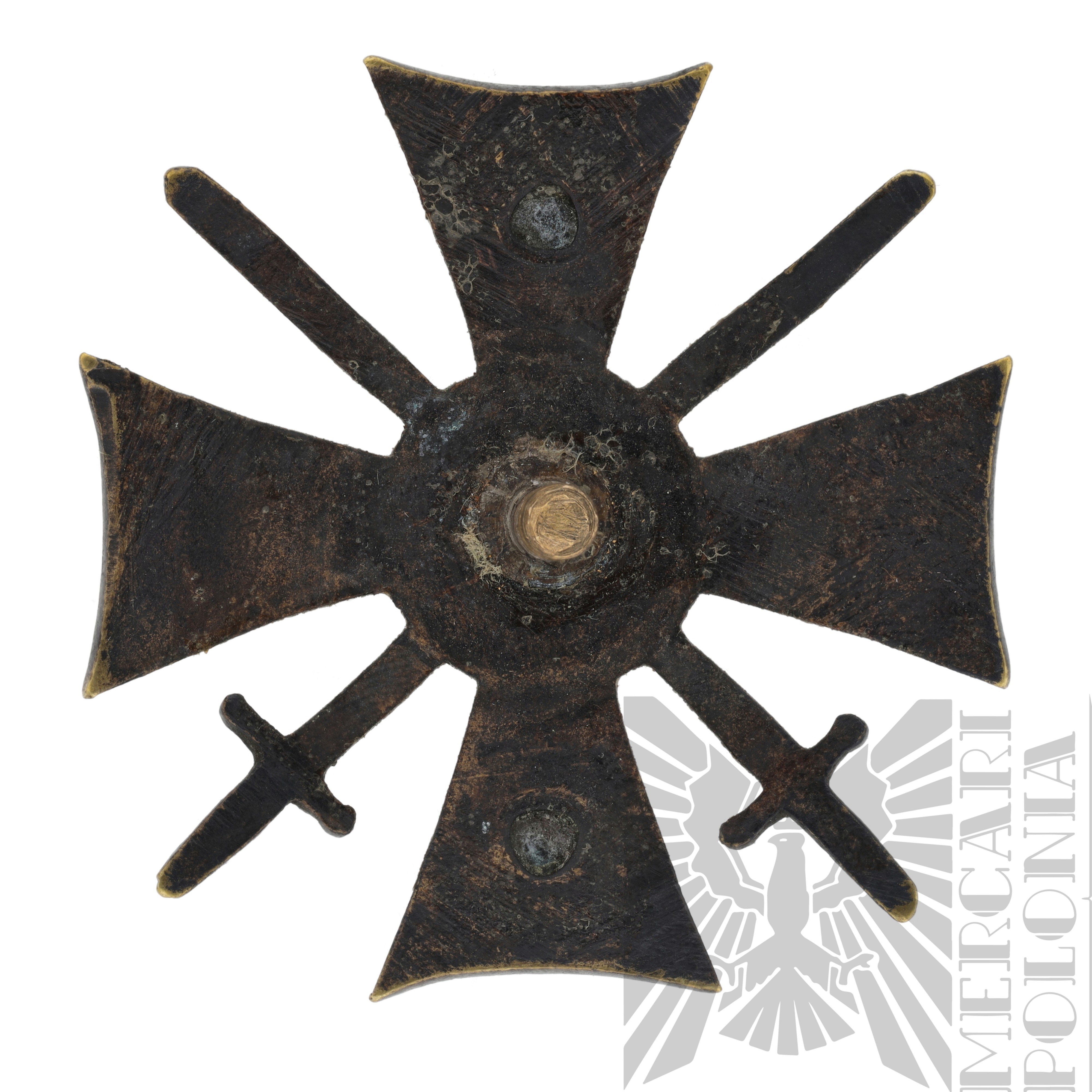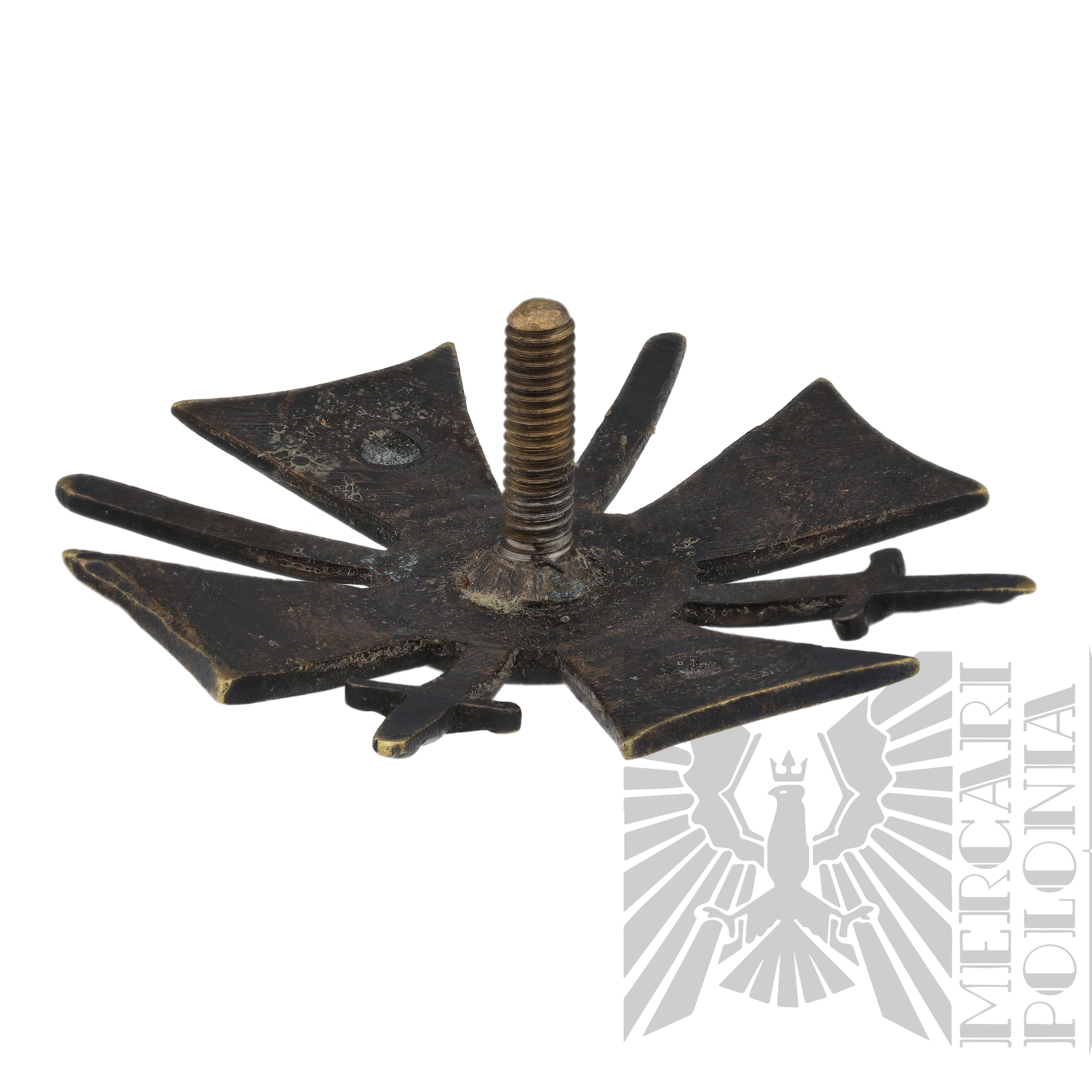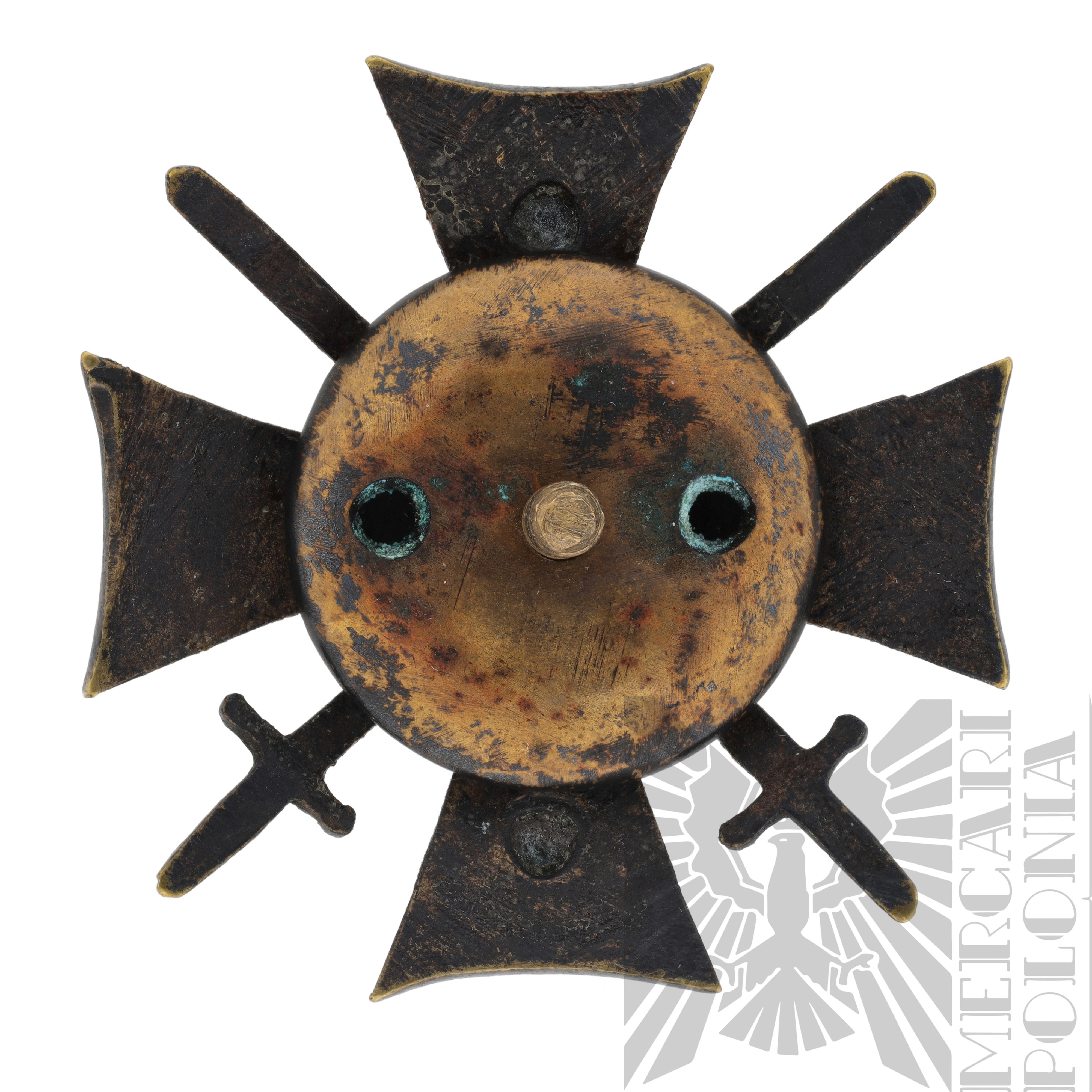 Odznaka ma formę krzyża maltańskiego, nałożonego na dwa skrzyżowane miecze z ostrzami skierowanymi ku górze.