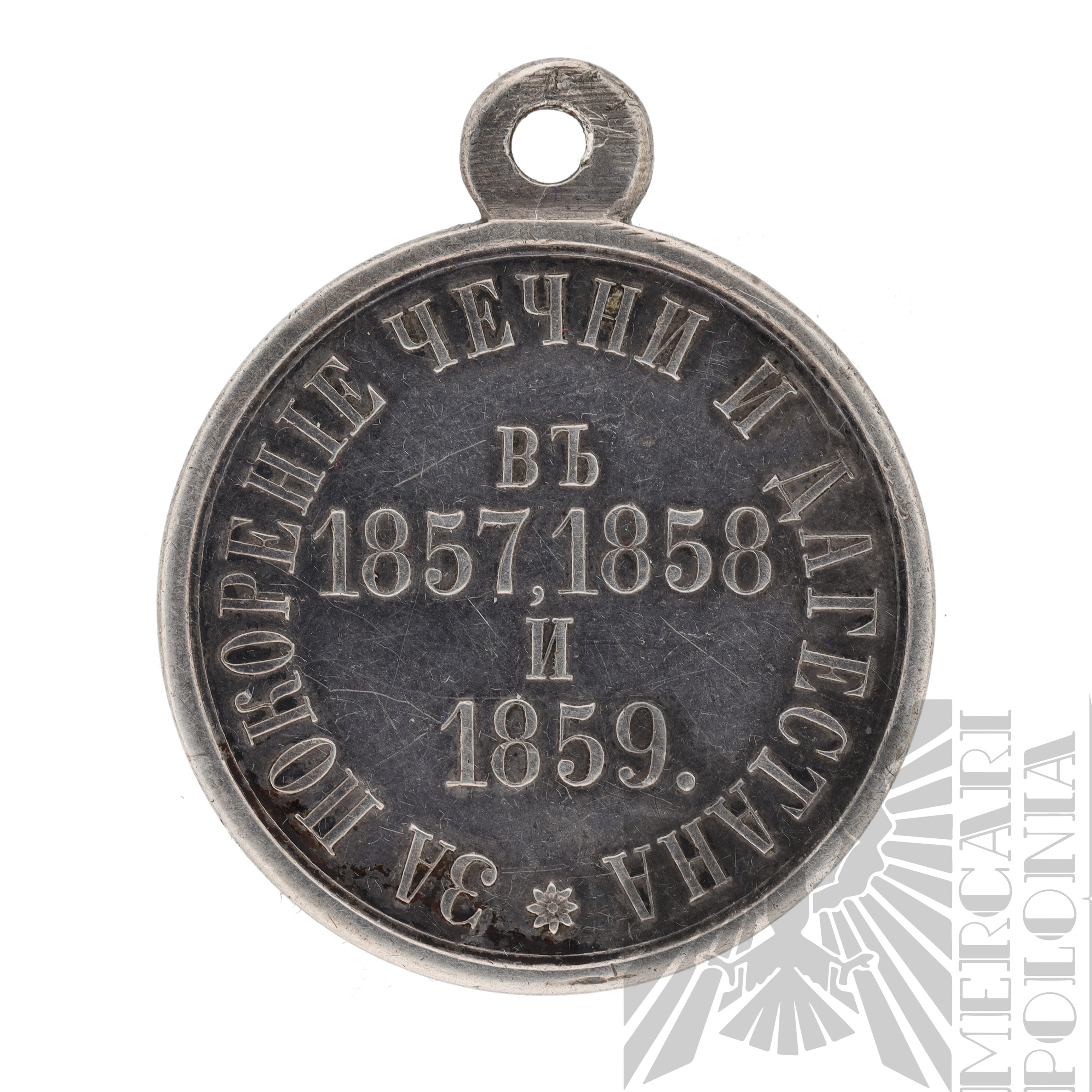 Odznaczenie przysługiwało wszystkim uczestnikom kampanii wojennych w Czeczenii i Dagestanie w latach 1857–1859. Mogli je otrzymać zarówno generałowie, oficerowie i szeregowi żołnierze, jak i ochotnicy, pracownicy administracji wojskowej i cywilnej, lekarze, pielęgniarki, duchowni współpracujący z armią, a także inni cywile wspierający działania wojskowe. Łącznie wręczono około 147 tysięcy takich medali. Medal ma kształt okrągłej srebrnej tarczy o średnicy 28 mm.