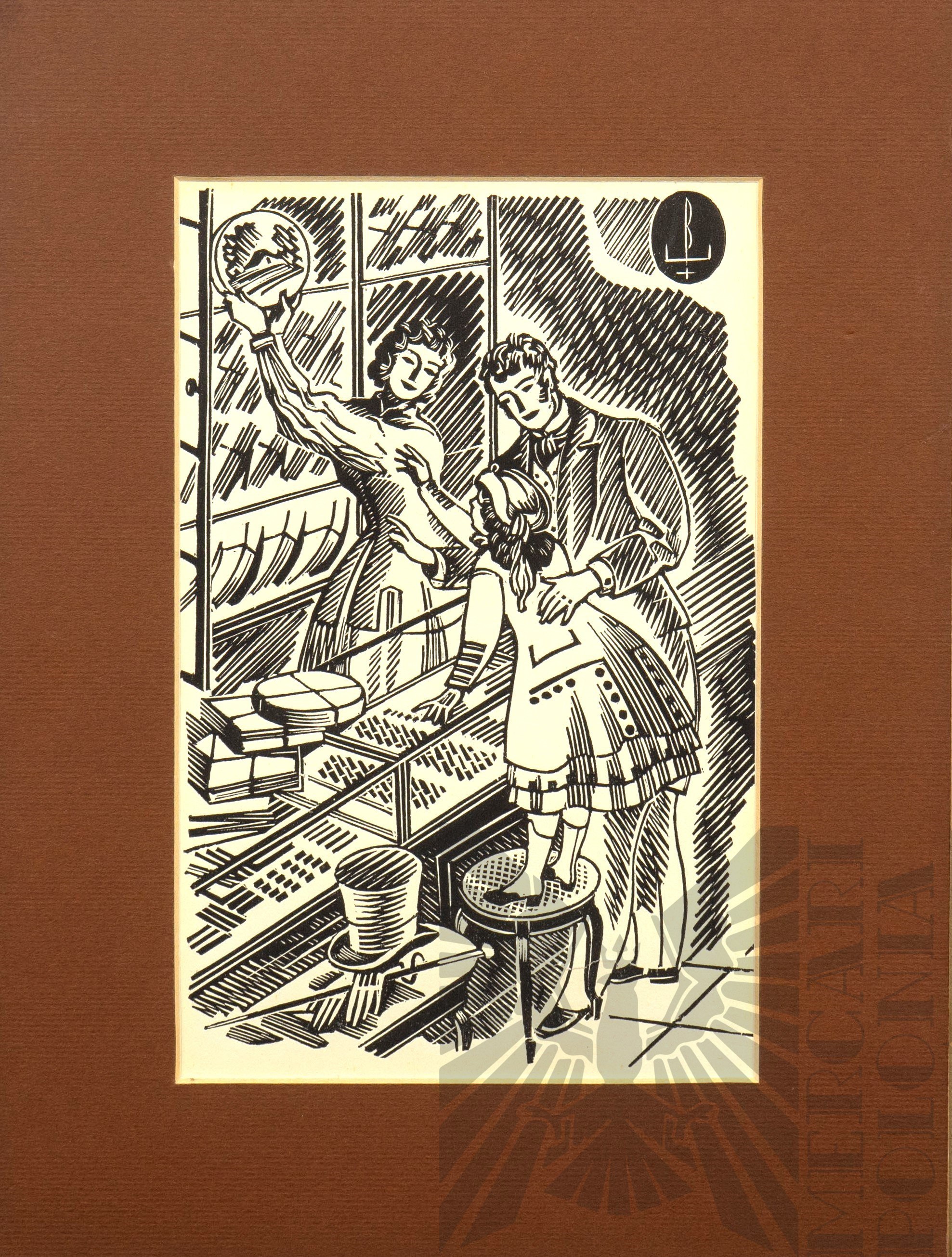 Edmund Bartłomiejczyk (1885 – 1950), U Wedla, 1938, drzeworyt, papier 16,5 x 11,5 cm (w świetle passe – partout), sygn. na płycie drzew. p. g. monogram wiązany „EB”.