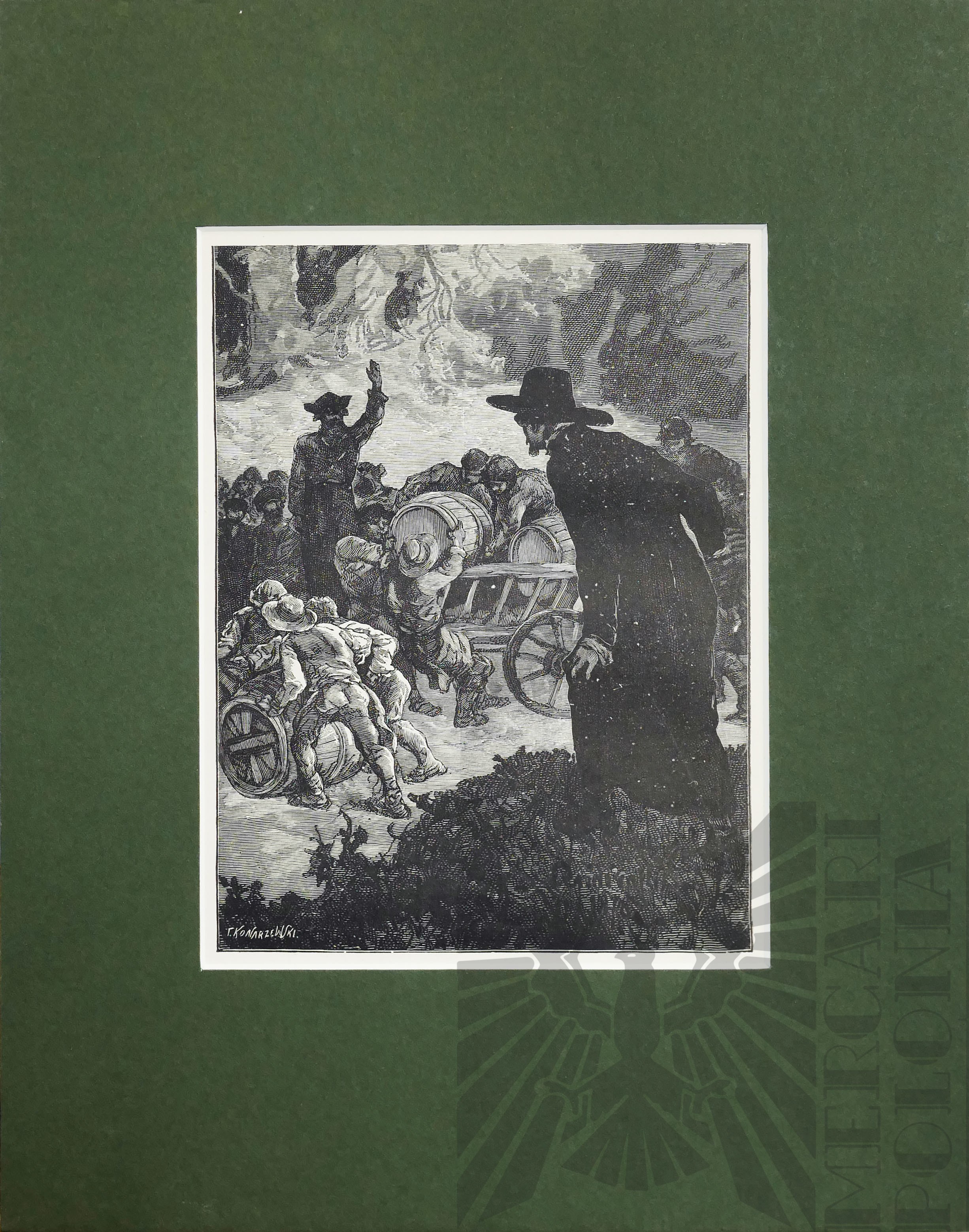 drzeworyt, papier, 20 x 14 cm w świetle passe – partout o wym. 31 x 24 cm sygn.: p.d. na płycie drzeworytniczej „Andriolli” oraz przez ksylografa p.d. „T.Konarzewski”.