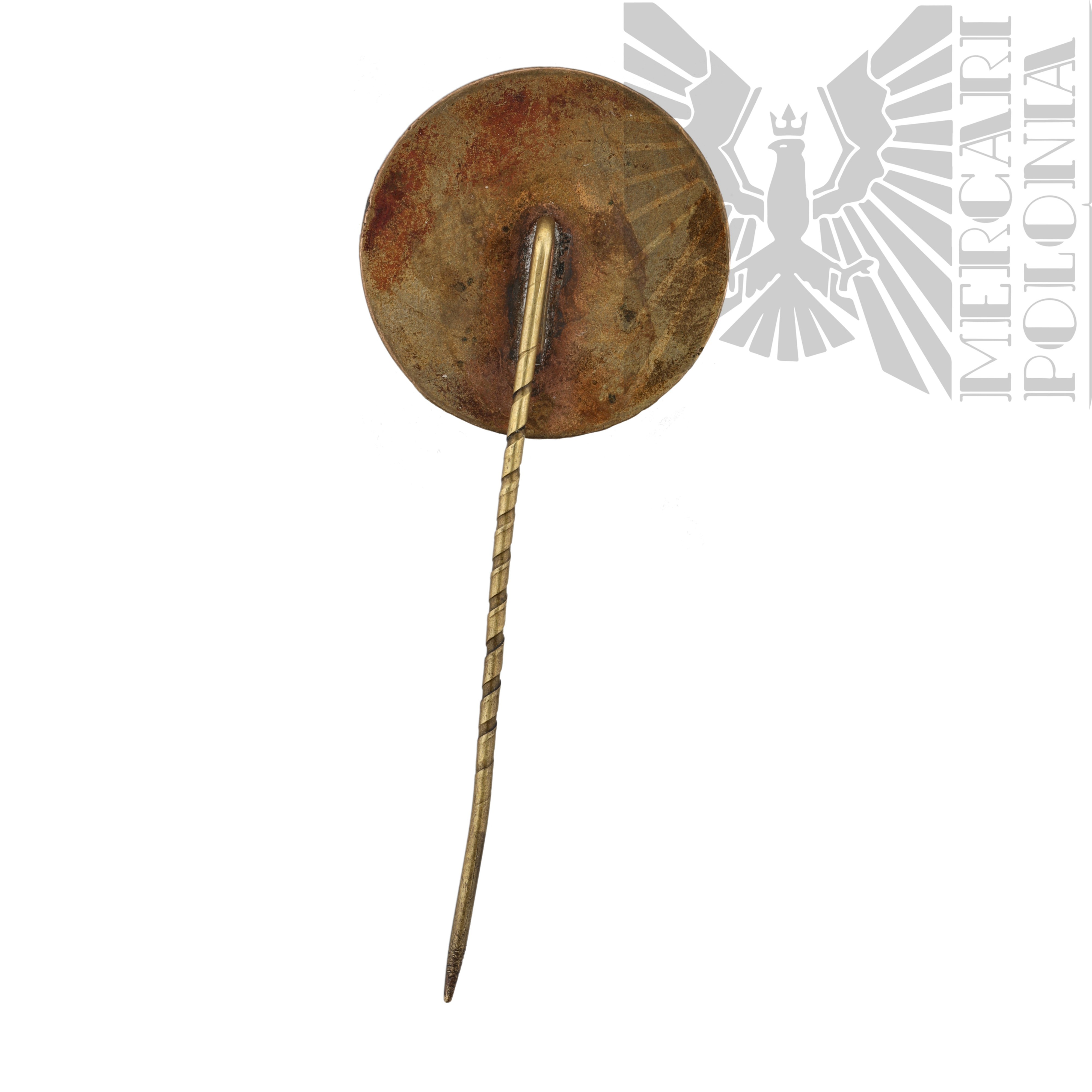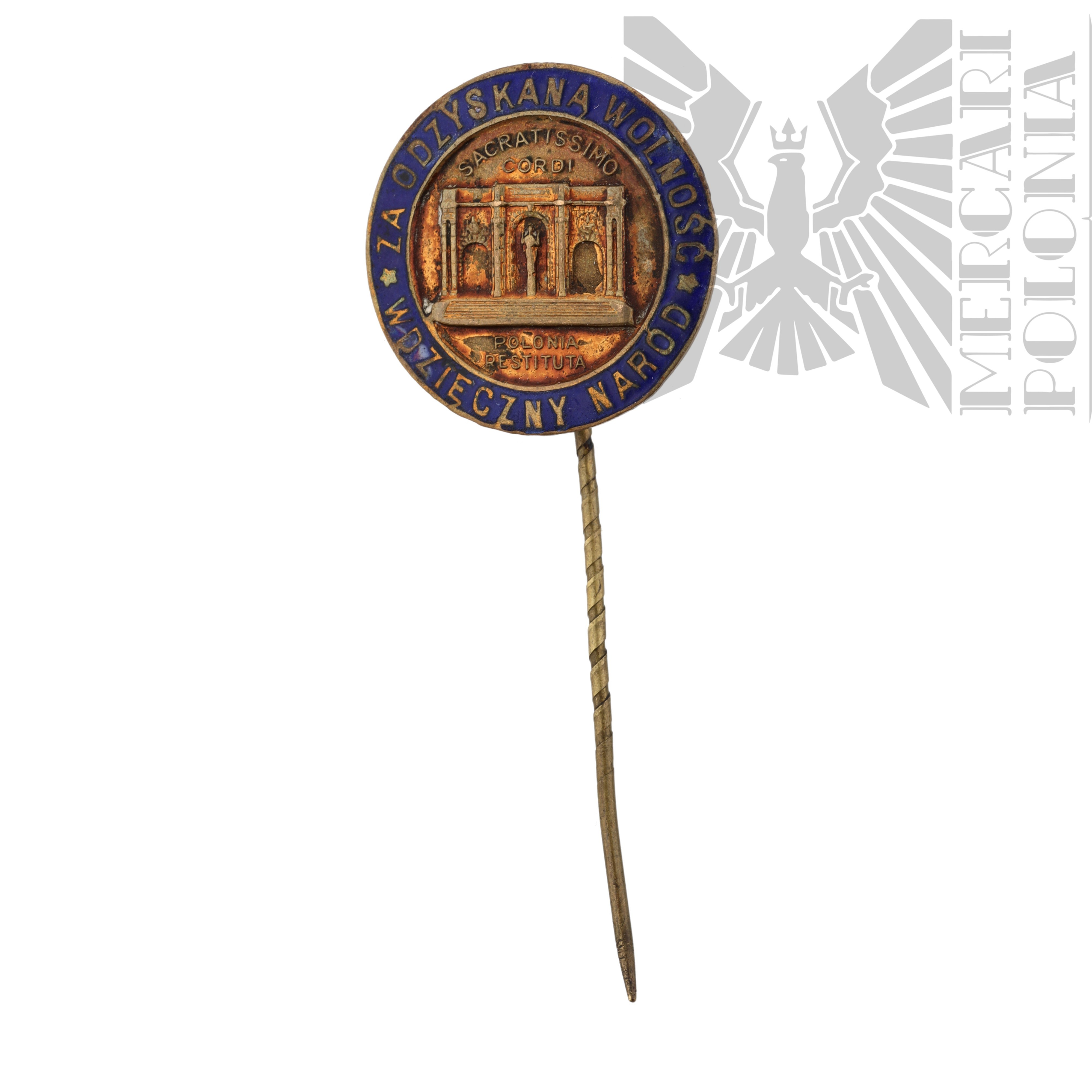 Znaczek pamiątkowy Za Odzyskaną Wolność Wdzięczny Naród, z wizerunkiem pomnika Serca Jezusowego w Poznaniu, dookoła wizerunku pomnika widoczny napis “Za odzyskaną wolność wdzięczny naród". Mocowanie na szpilkę.