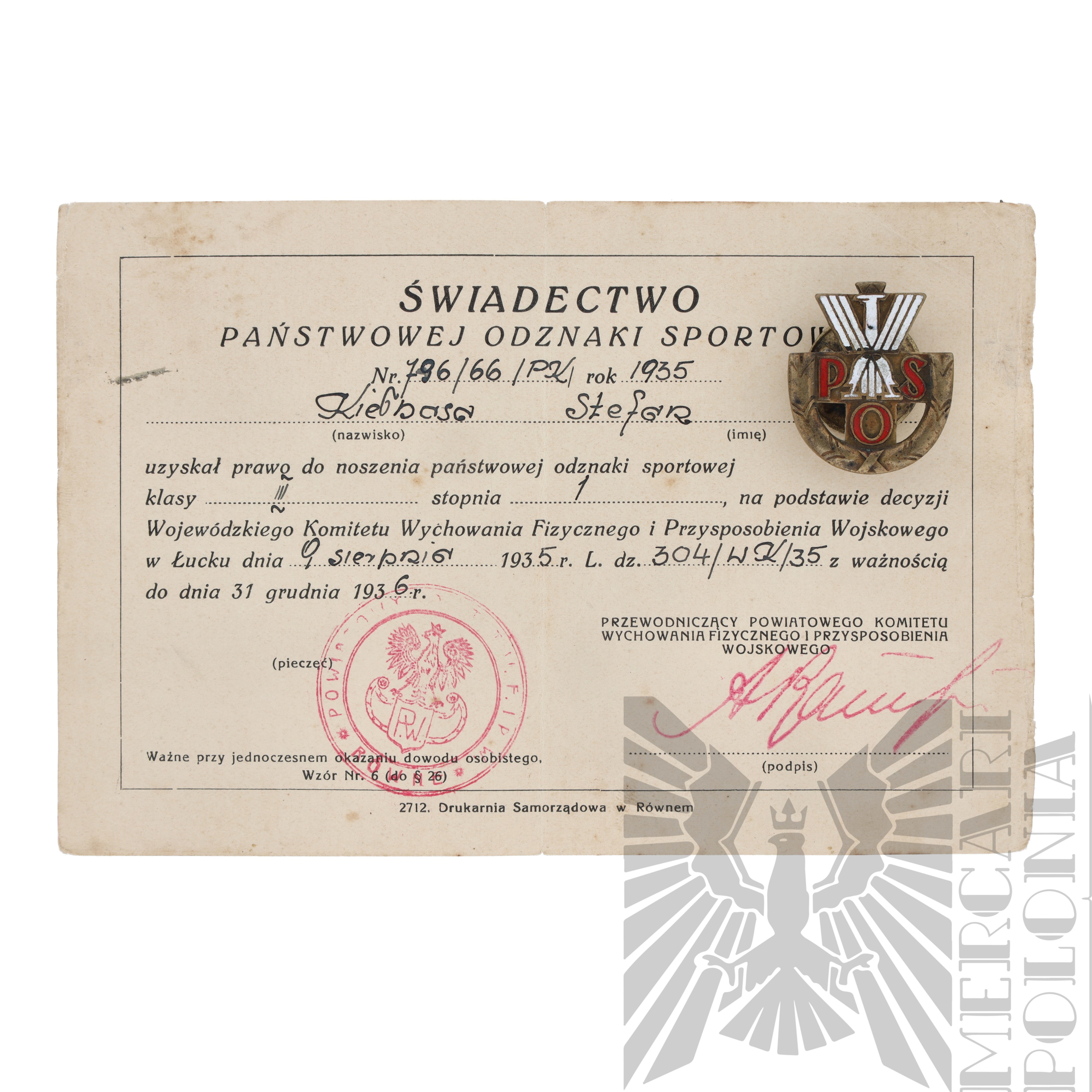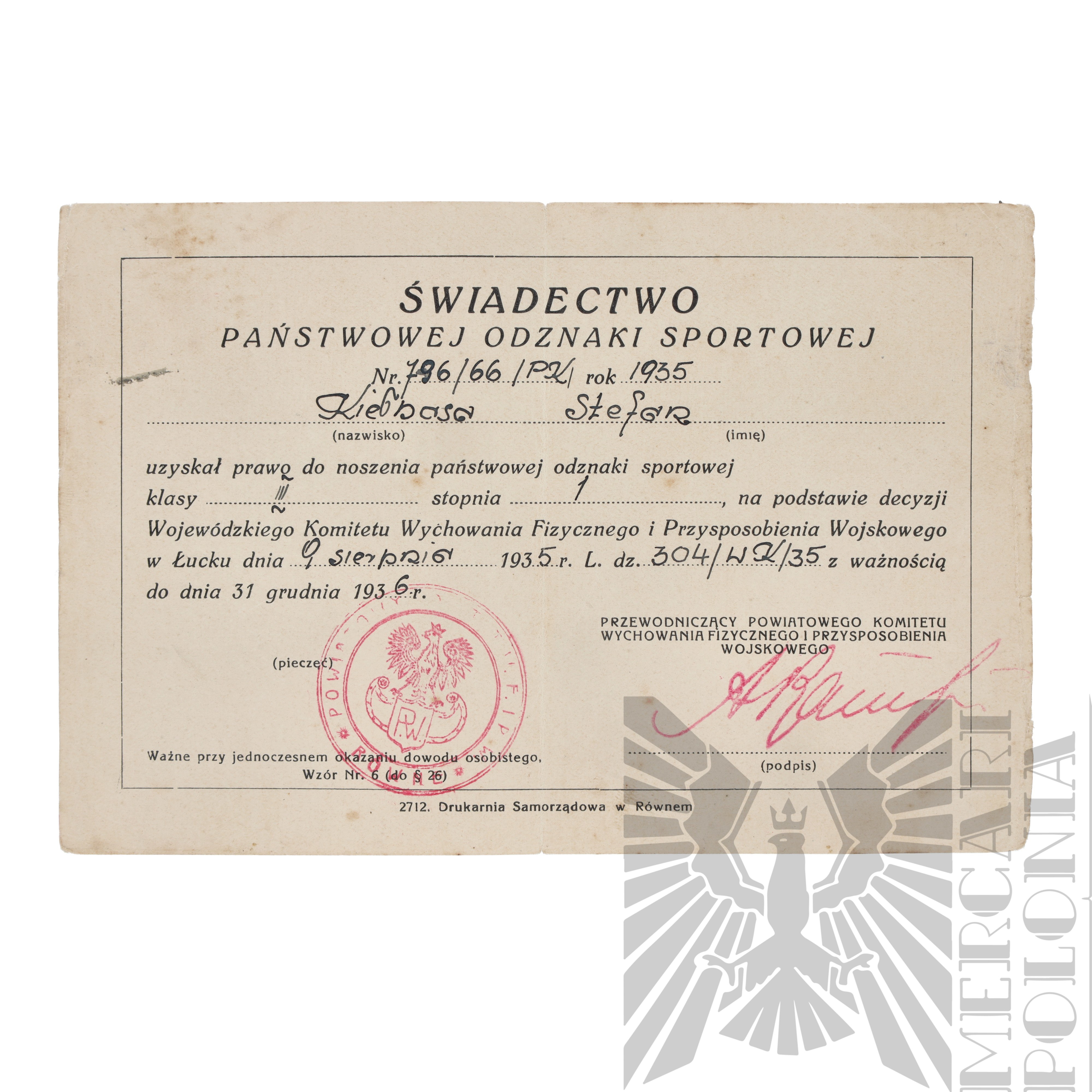 [KIEŁBASA] II RP Państwowa Odznaka Sportowa III Klasy z Legitymacją - Stefan Kiełbasa Korpus Ochrony Pogranicza Batalion “Hoszcza”