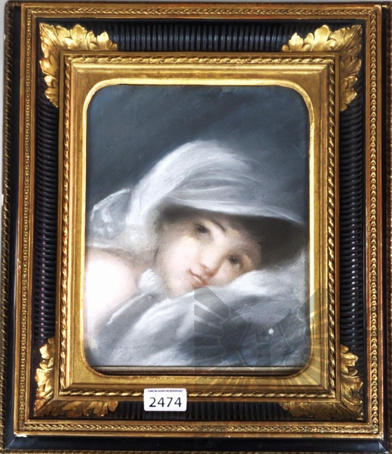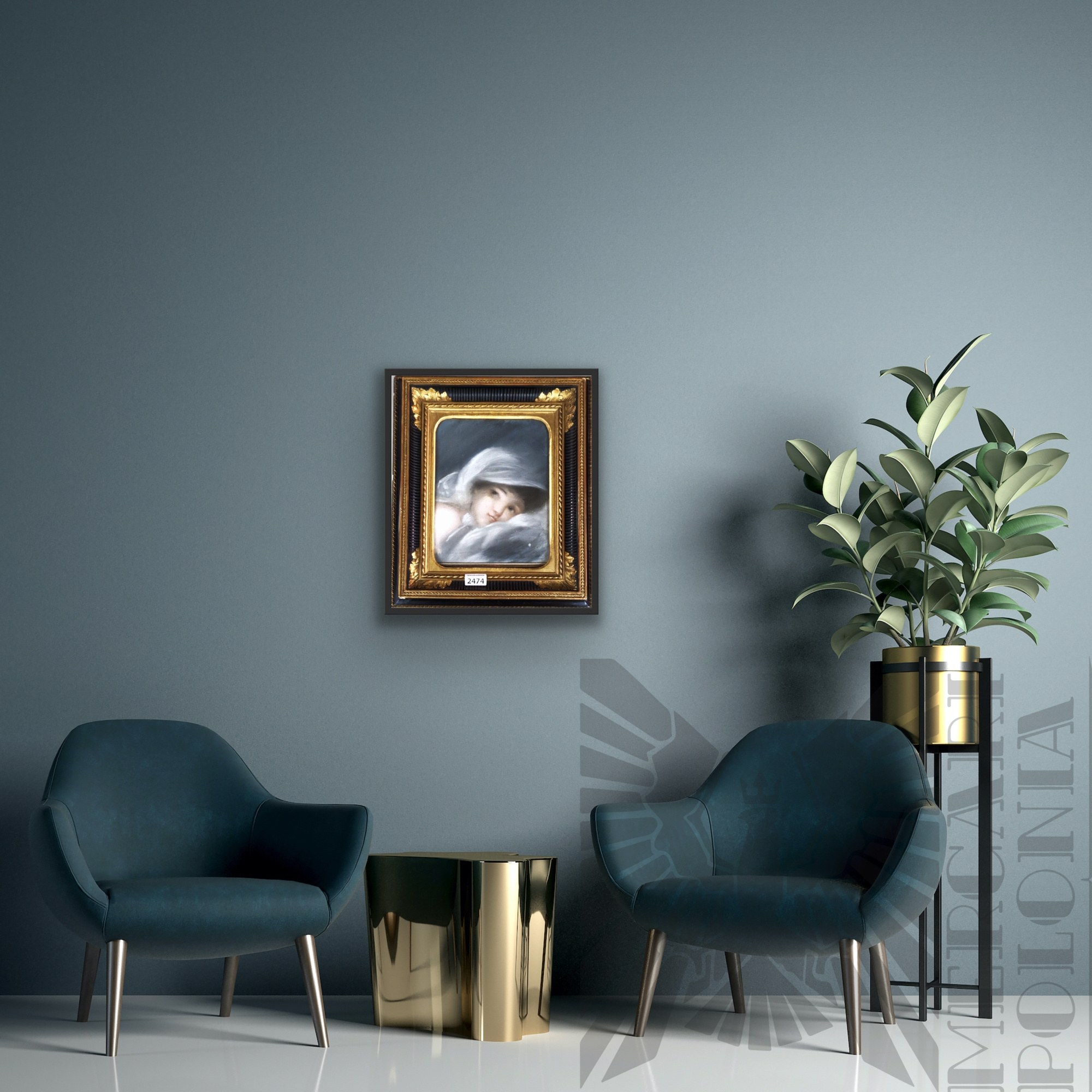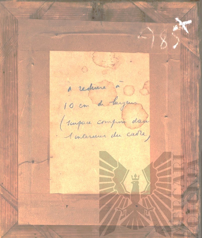 Pastel, karton 26 x 20 cm w świetle oprawy; oprawiona w niezwykle bogato dekorowaną ramę o wym.40 x 34 cm. Na odwrociu inskrypcja w jęz. francuskim.