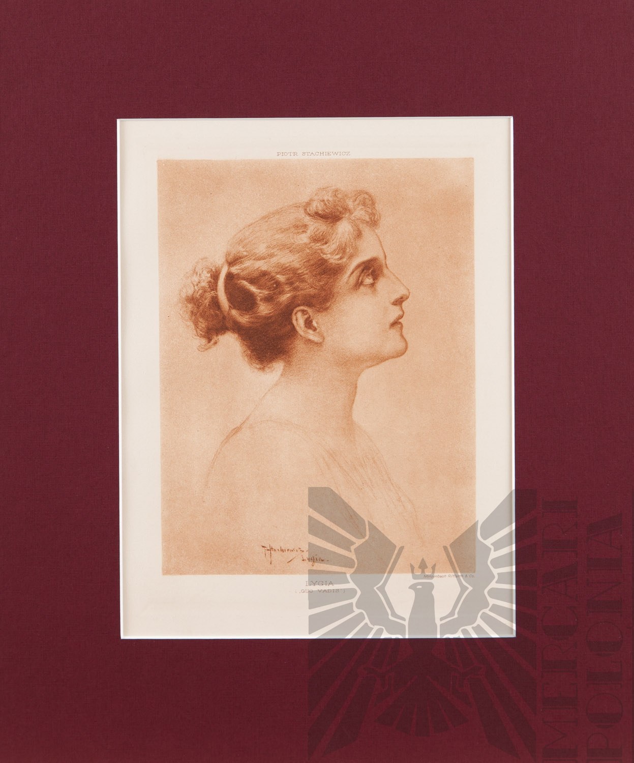 heliograwiura, papier; 23 x 17,5 cm (odcisk płyty), 37,5 x 31 cm (oprawa, passe-partout); sygn. i opisany na płycie u dołu.: P. Stachiewicz / Lygia.; opisany pod zadrukiem: LYGIA / ("QUO VADIS"); Meisenbach Riffarth & Co.