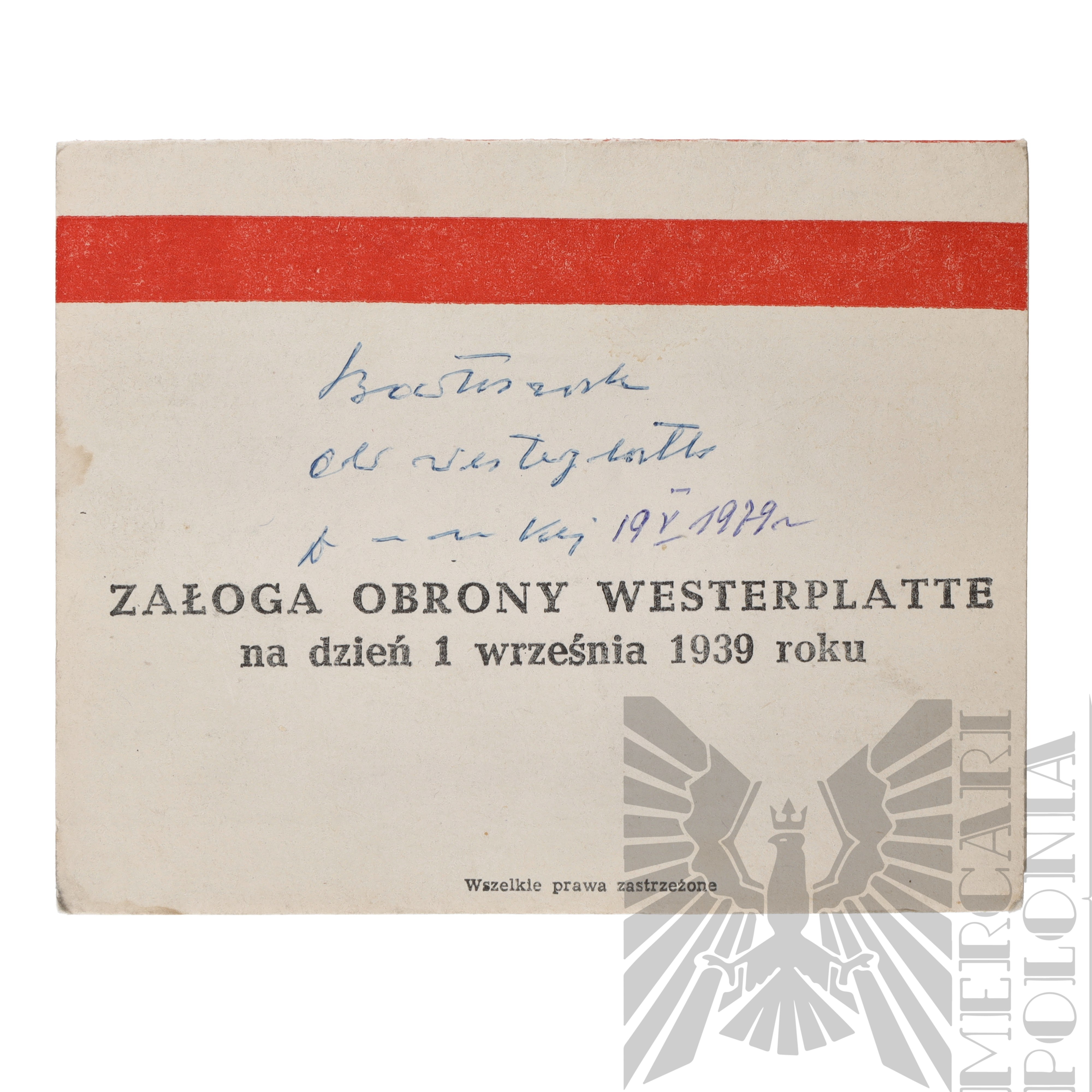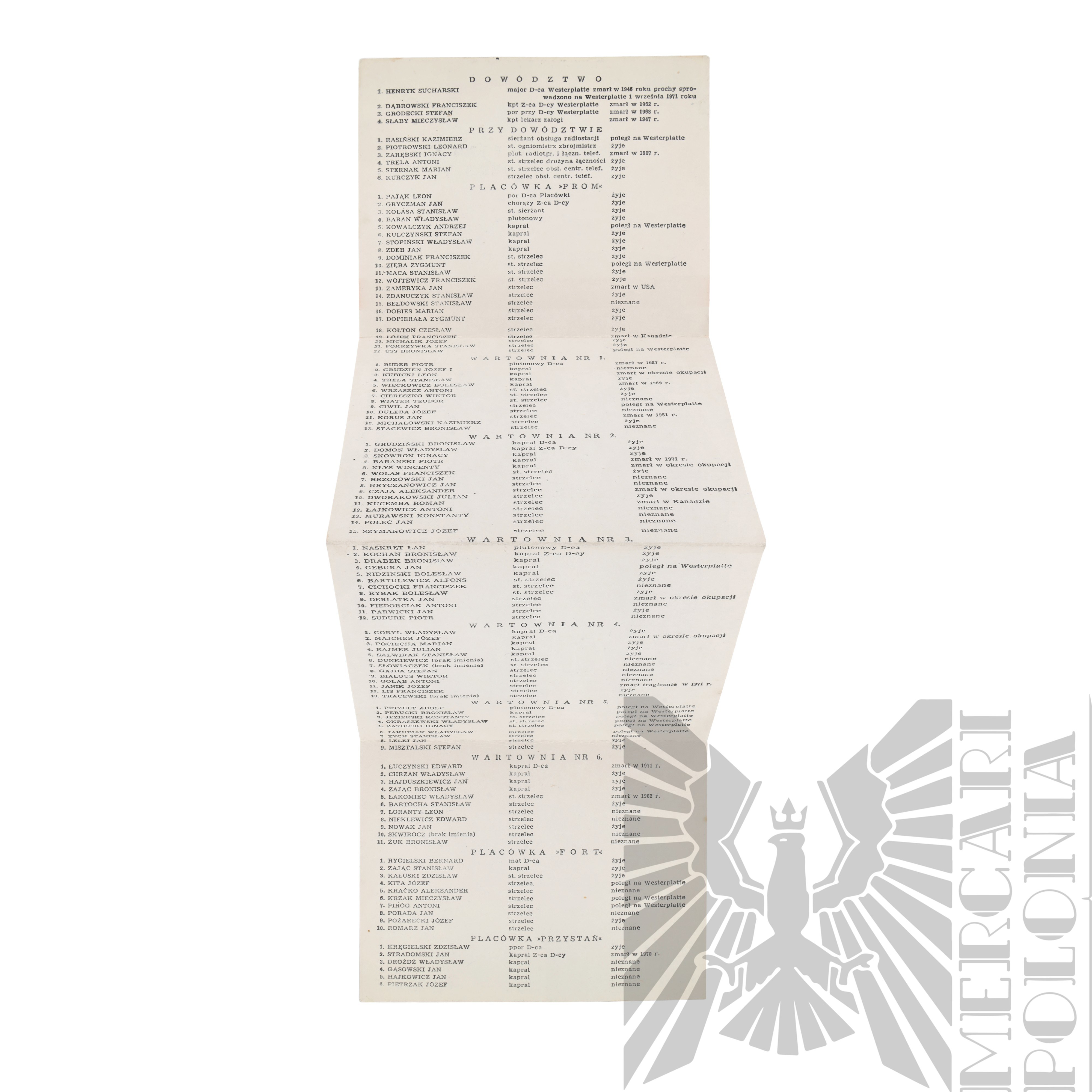Lista załogi obrony Westerplatte podzielona na poszczególne placówki i ich załogę z uwzględnieniem dalszych losów obrońców. Lista została wydana w Gdańsku w 1974 roku.