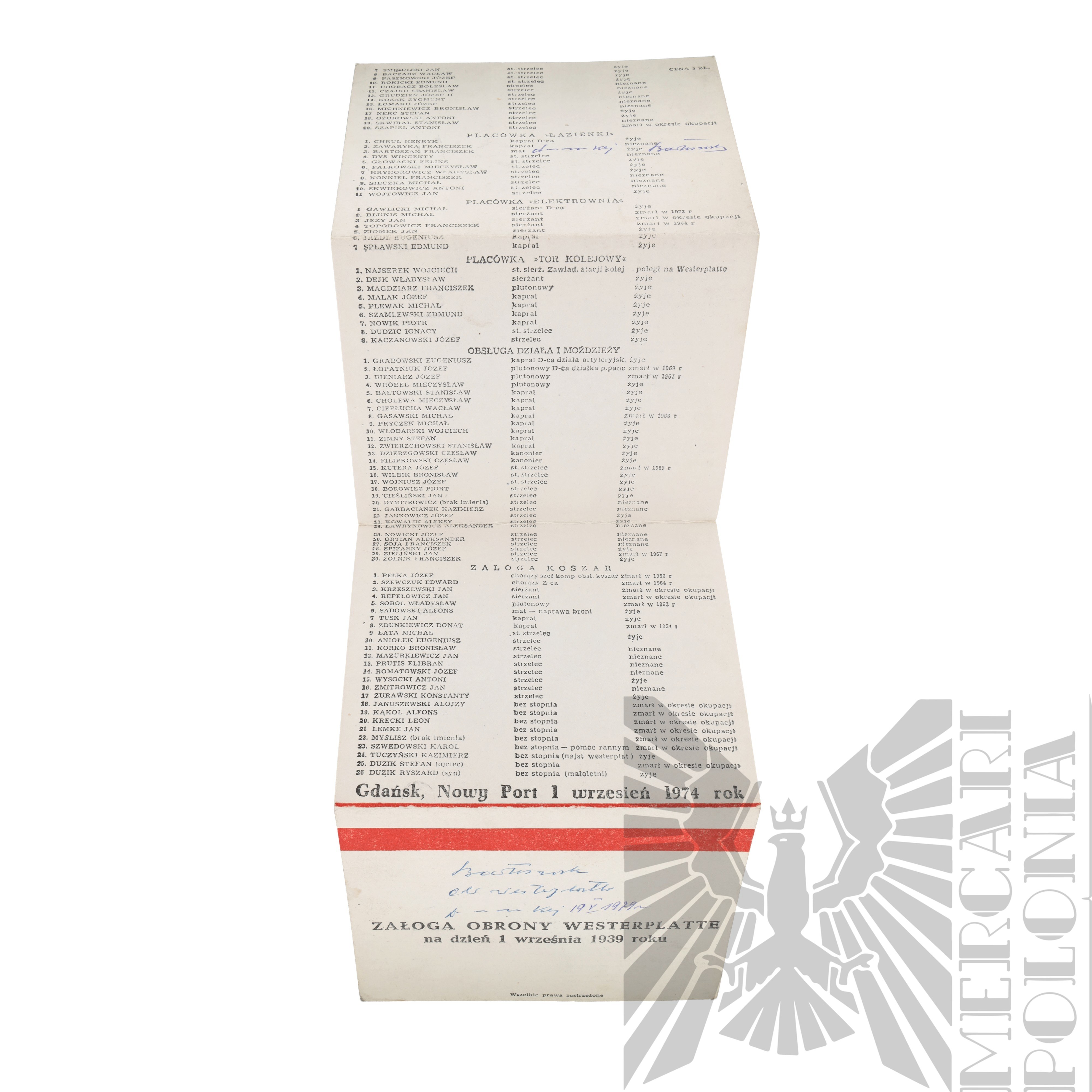 PRL Lista z Nazwiskami Obrońców Westerplatte Gdańsk 1974