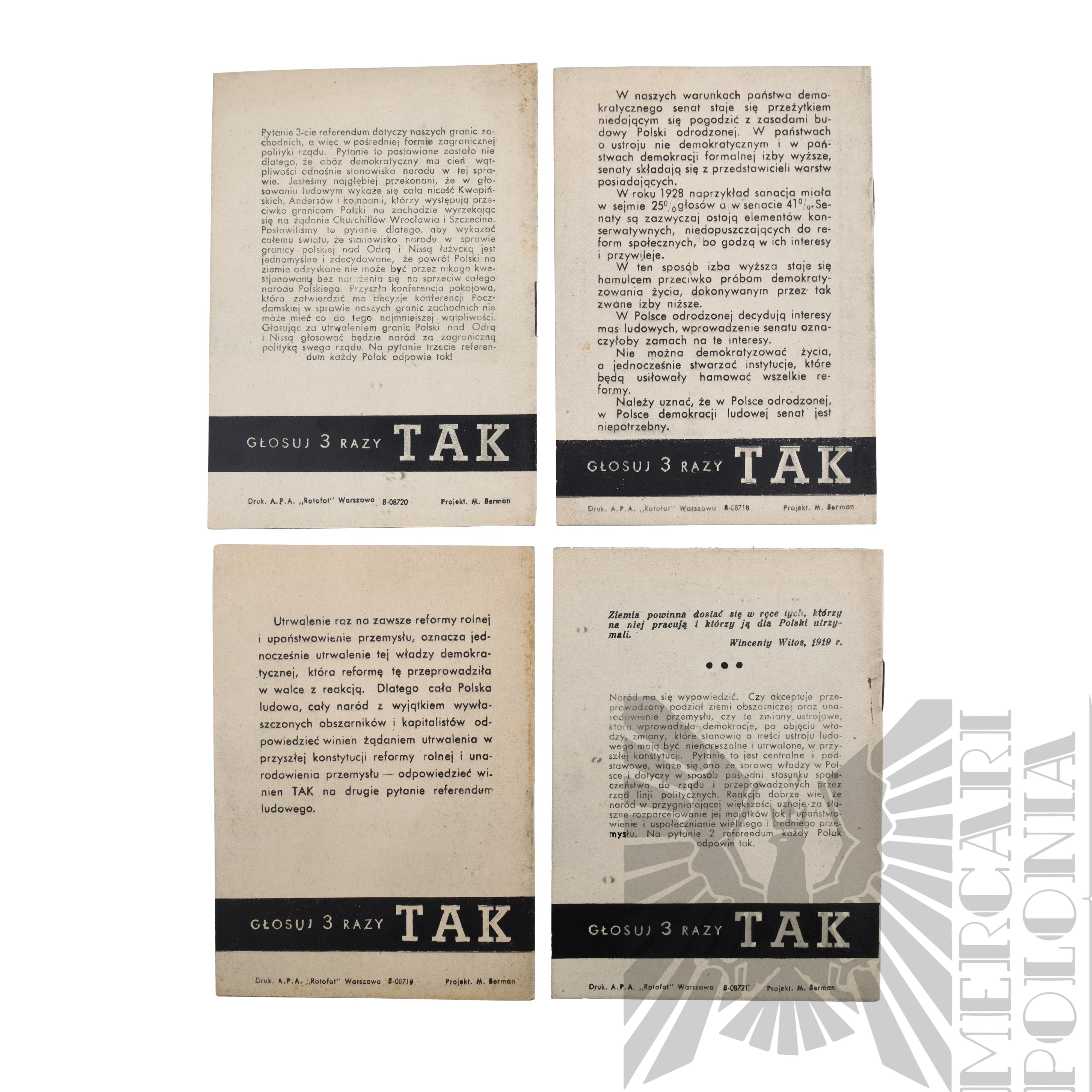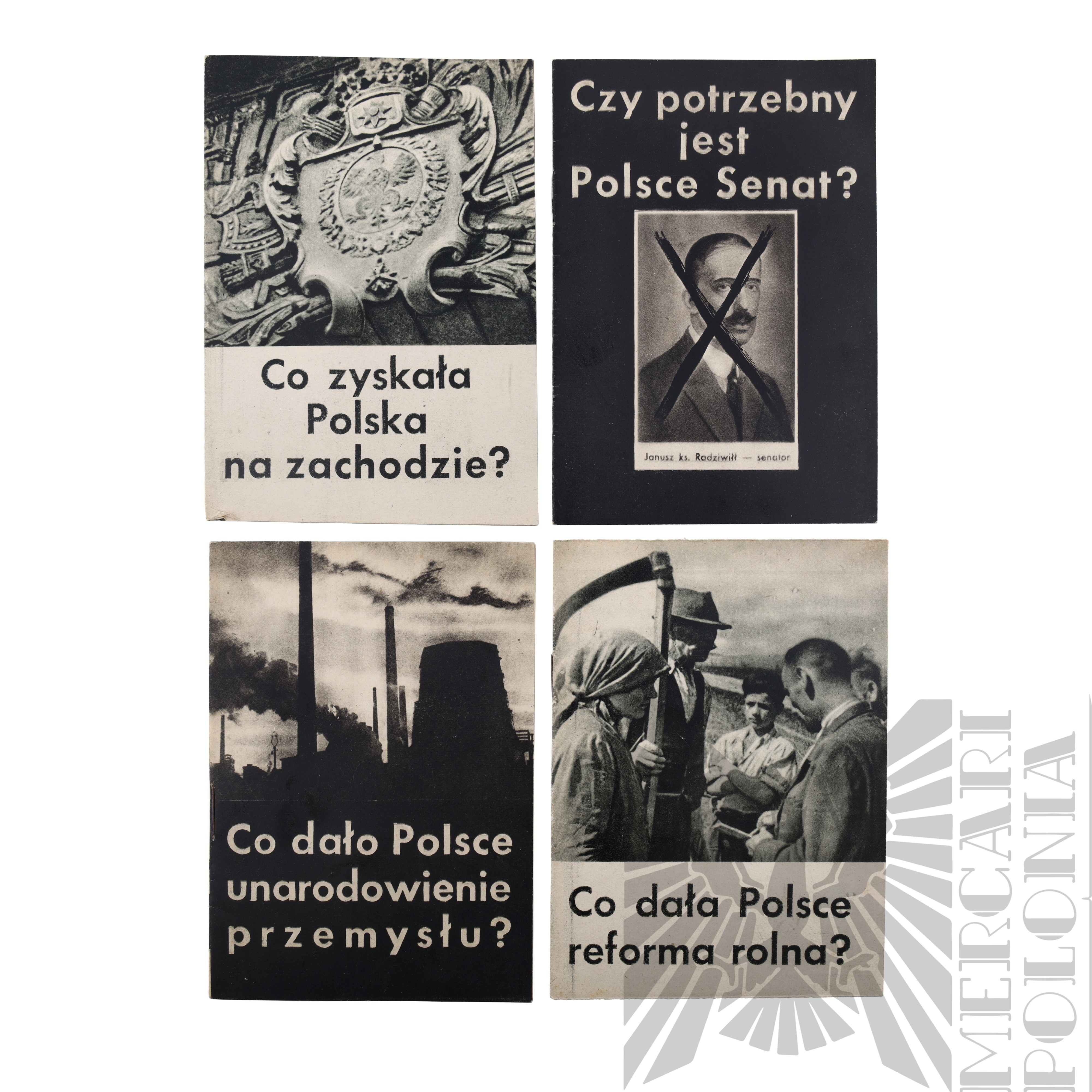 Zestaw 4 broszur propagandowych przedstawiających sytuację Polski po zakończeniu 2 wojny światowej i pokazująca jej progres pod rządami komunizmu zachęcająca społeczeństwo do utrwalenia zmian. Broszury poruszają temat unarodowienia przemysłu, reformy rolnej, korzyści z ziem odzyskanych oraz nawoływanie do zniesienia senatu.