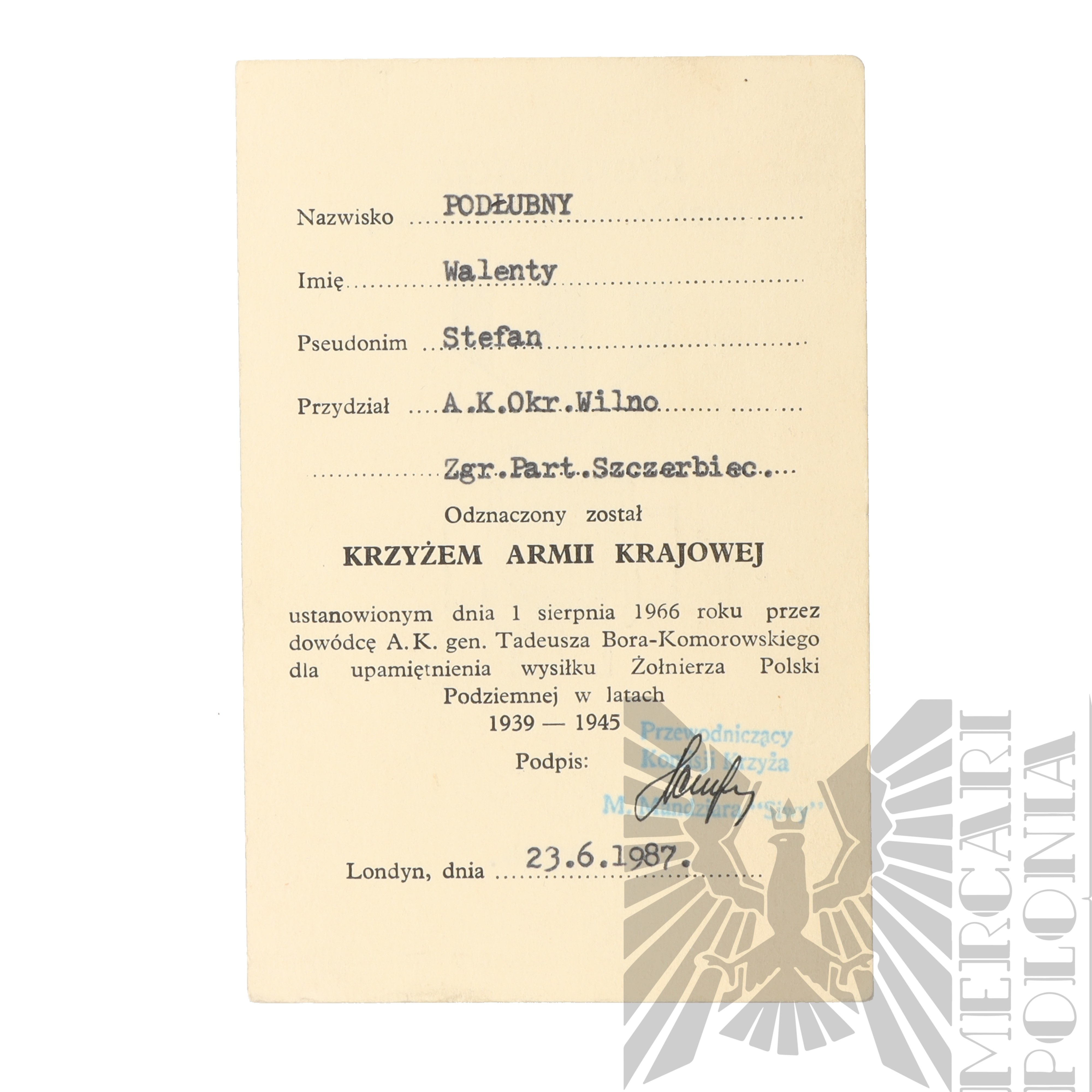 Zestaw zawiera Krzyż Armii Krajowej wraz z nadaniem na Walentego Podłubnego ps. Stefan, który służył w Okręgu AK Wilno w Zgrupowaniu Partyzanckim Szczerbiec. Legitymacja wystawiona 23 czerwca 1987 roku w Londynie.