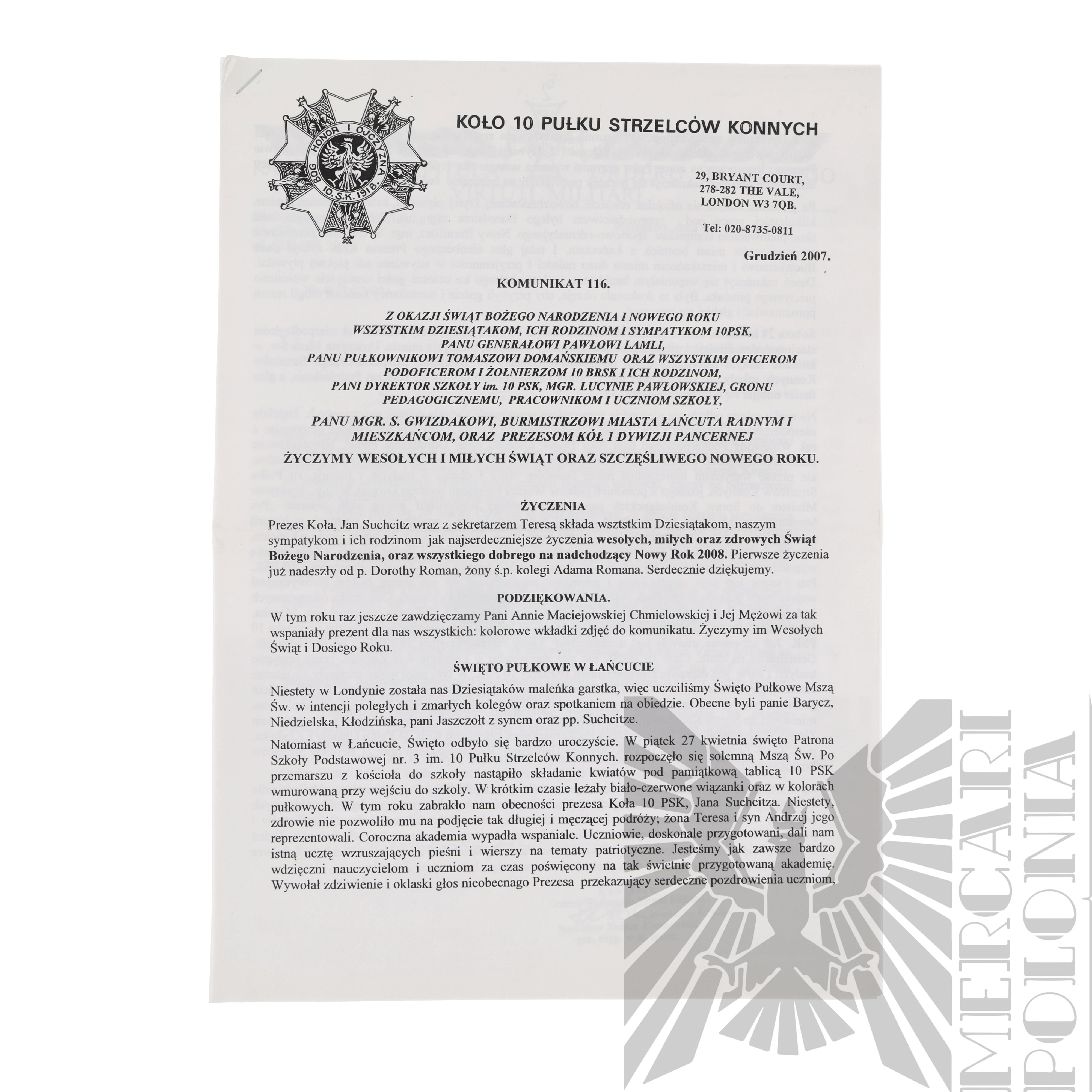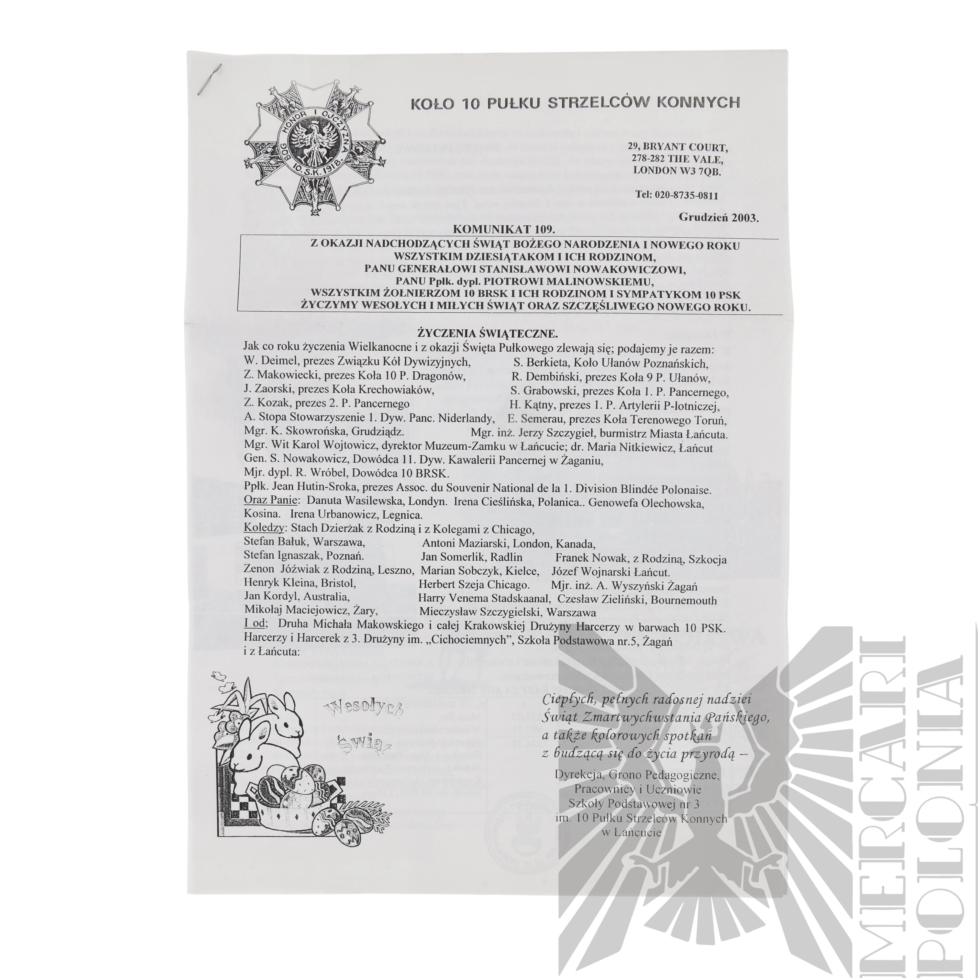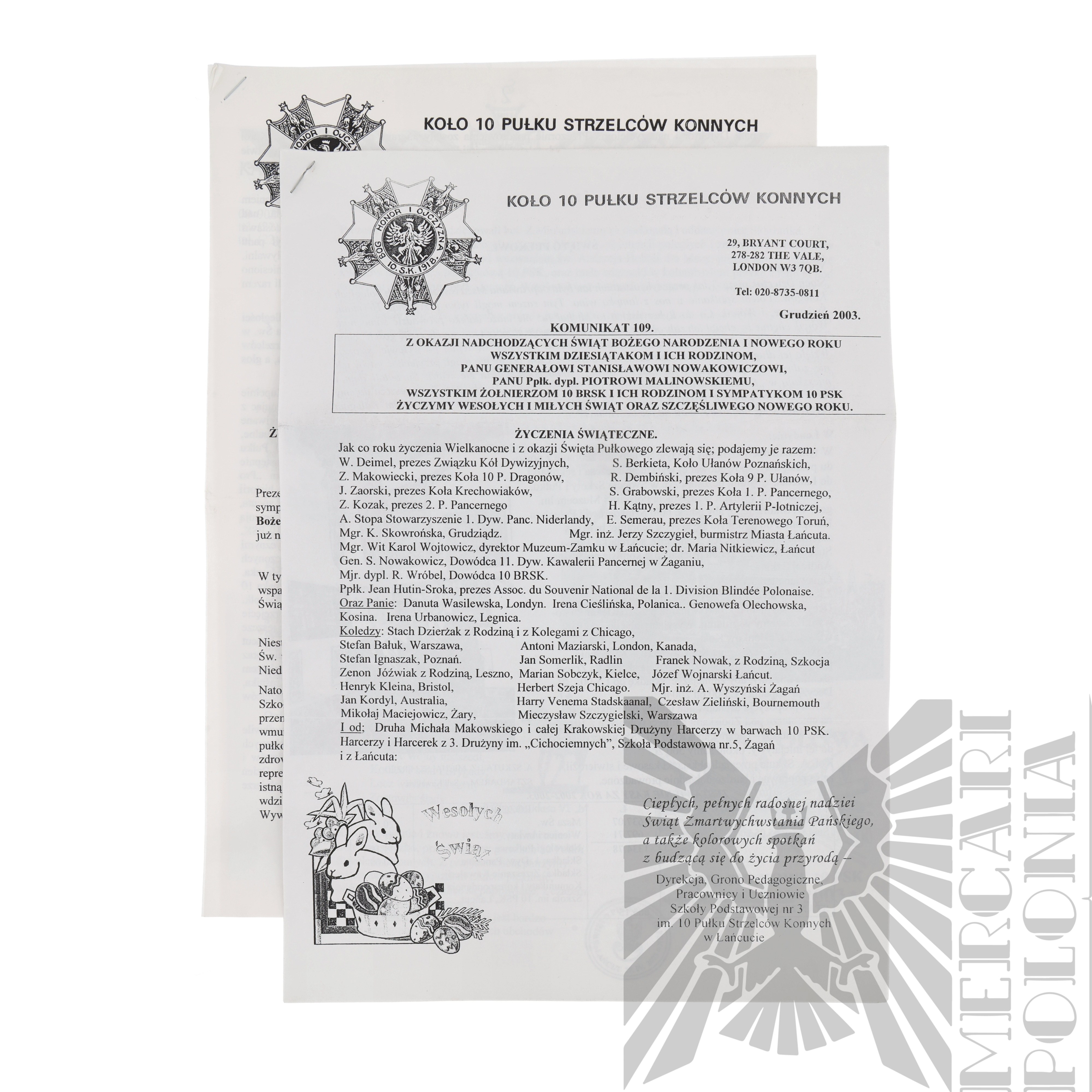 Dwa komunikaty Koła 10 Pułku Strzelców Konnych w tym jeden z życzeniami wielkanocnymi.