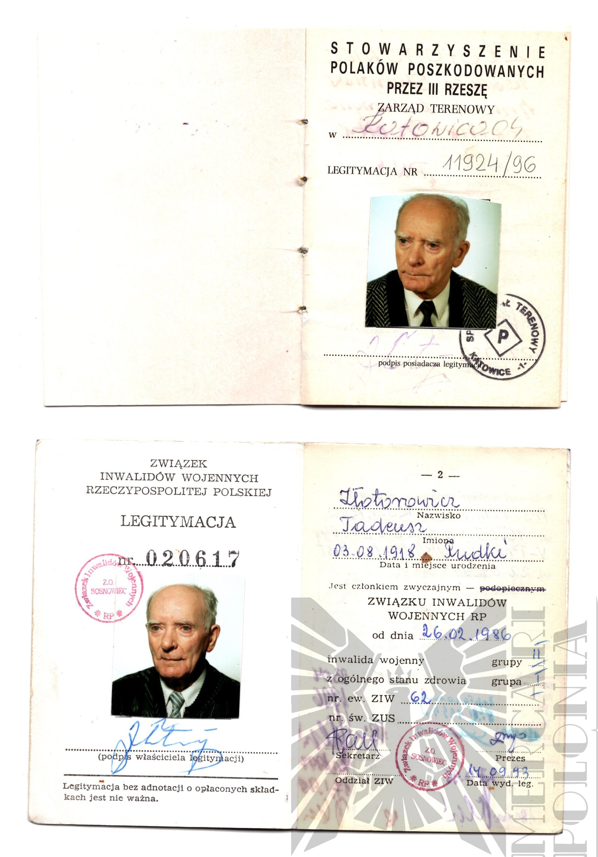 Zestaw dwóch książeczek, jedna Związku Inwalidów Wojennych RP, druga Stowarzyszenia Polaków Poszkodowanych Przez III Rzeszę wystawione na Tadeusza Złotorowicza.