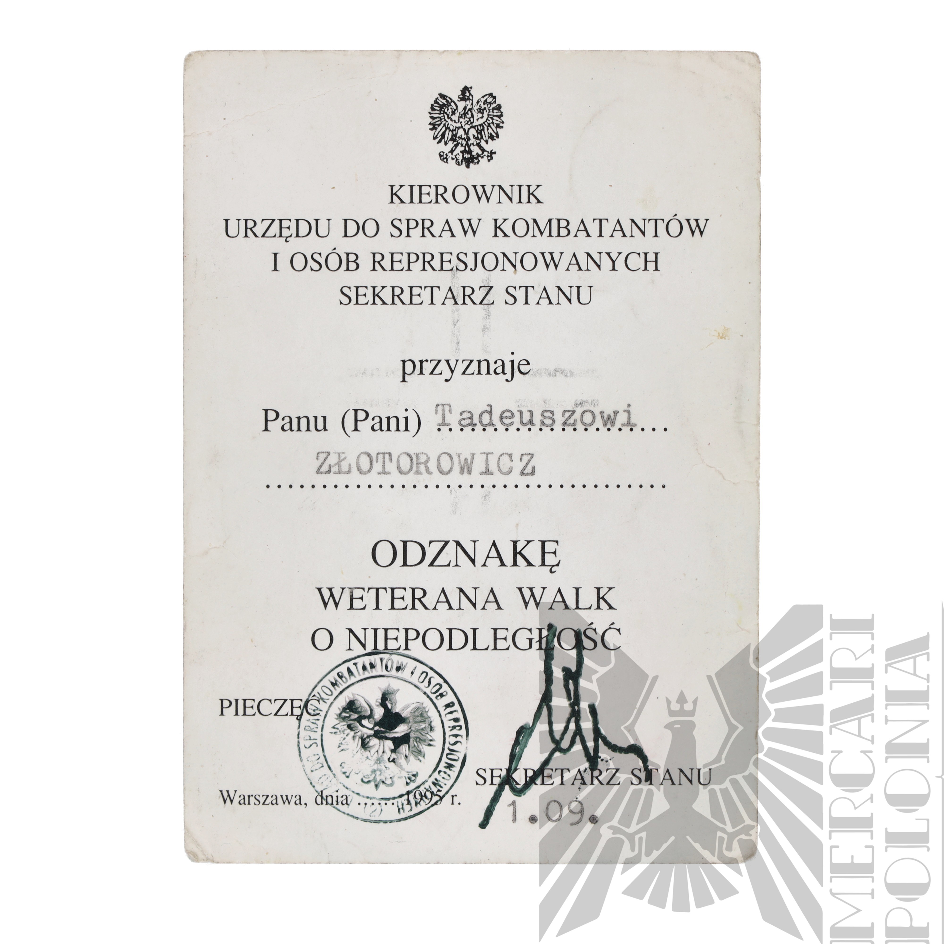 Legitymacja do Odznaki Weterana Walk o Niepodległość nadana Tadeuszowi Złotorowiczowi w 1995 roku nadaną przez Urząd Do Spraw Kombatantów i Osób Represjonowanych.
