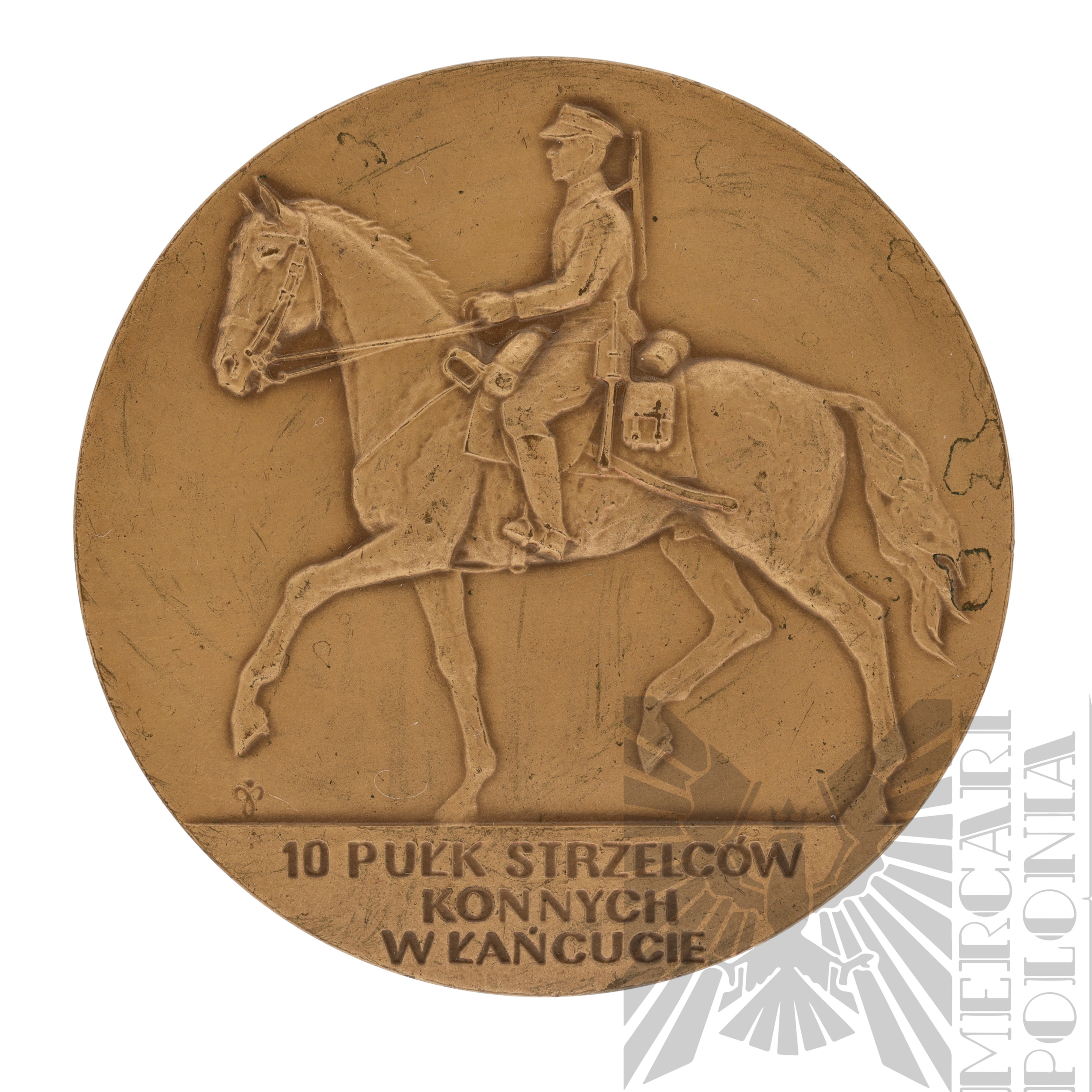 Na awersie znajduje się wizerunek kawalerzysty w pełnym umundurowaniu, jadącego na koniu w pozycji stępa, co symbolizuje żołnierską gotowość i tradycję kawaleryjską pułku. Poniżej umieszczony jest napis „10 PUŁK STRZELCÓW KONNYCH W ŁAŃCUCIE”, identyfikujący jednostkę, której medal jest poświęcony.