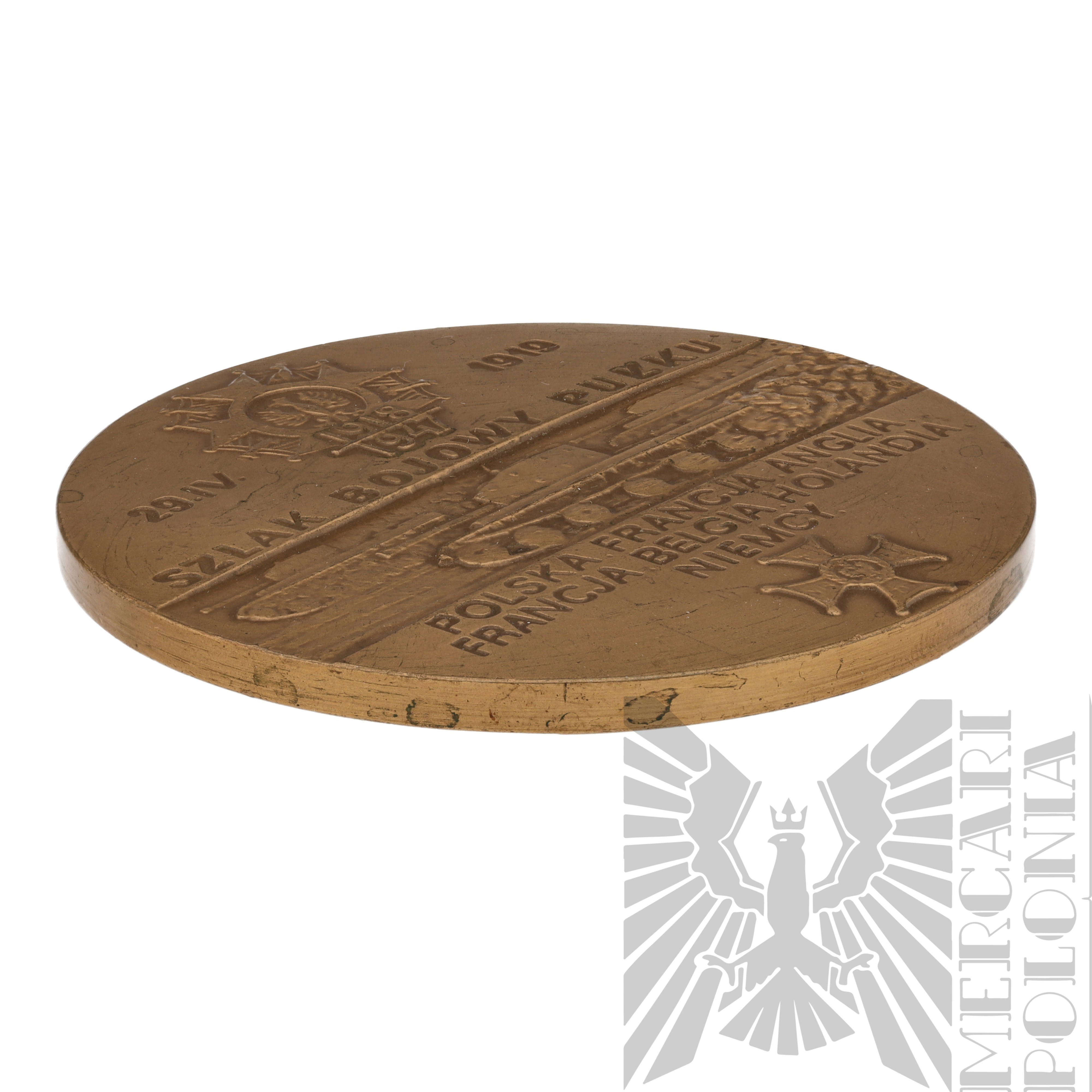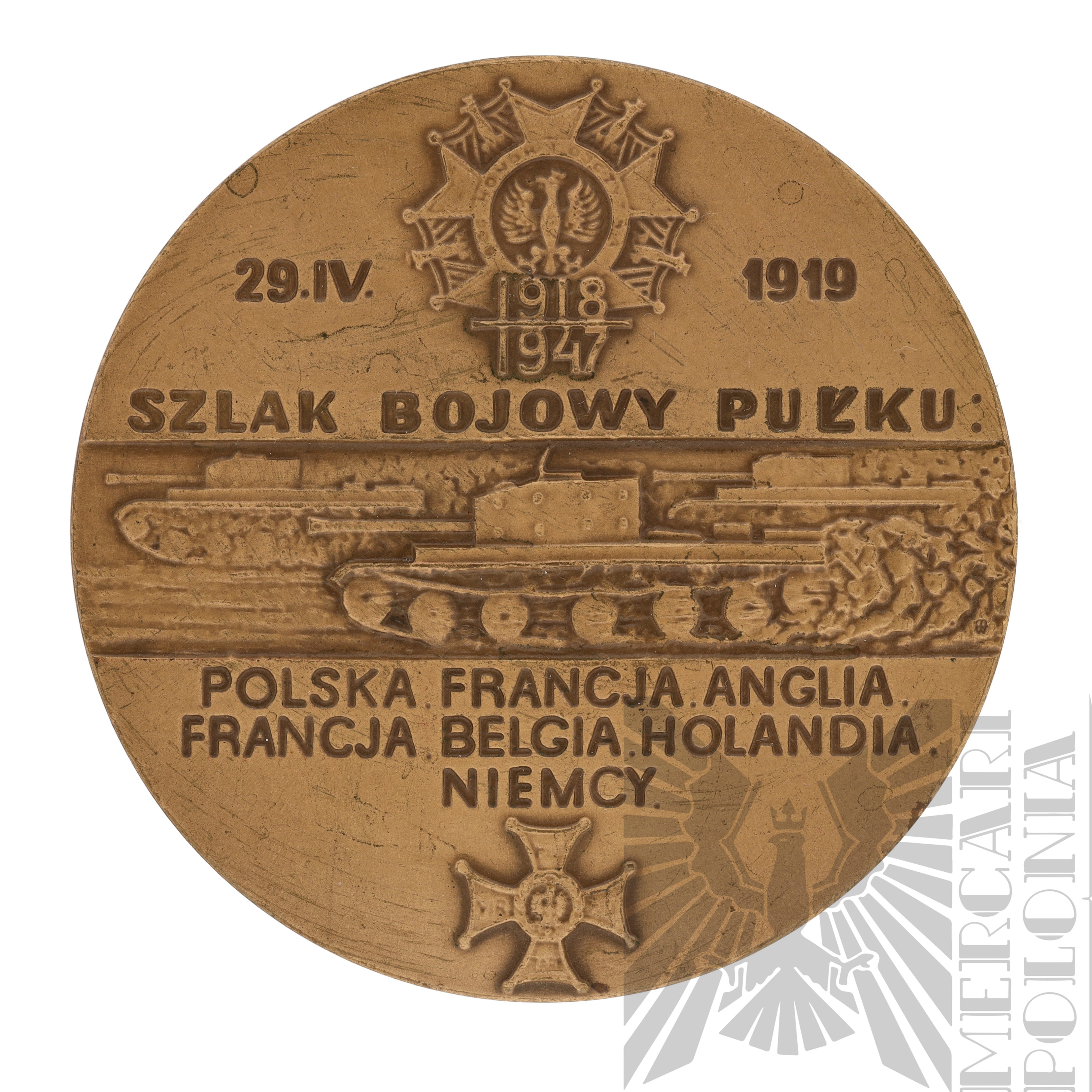 Na rewersie widoczny jest symboliczny „szlak bojowy pułku”, z datą „29.IV.1919”. Nad sceną znajduje się orzeł w wieńcu laurowym z datami „1918 – 1947”, podkreślającymi okres działalności pułku. Centralnym elementem jest sylwetka czołgu, co wskazuje na udział pułku w walkach pancernych w czasie II wojny światowej, mimo jego kawaleryjskiego rodowodu. Na dole wymienione są kraje, przez które prowadził szlak bojowy jednostki: Polska, Francja, Anglia, Belgia, Holandia i Niemcy.