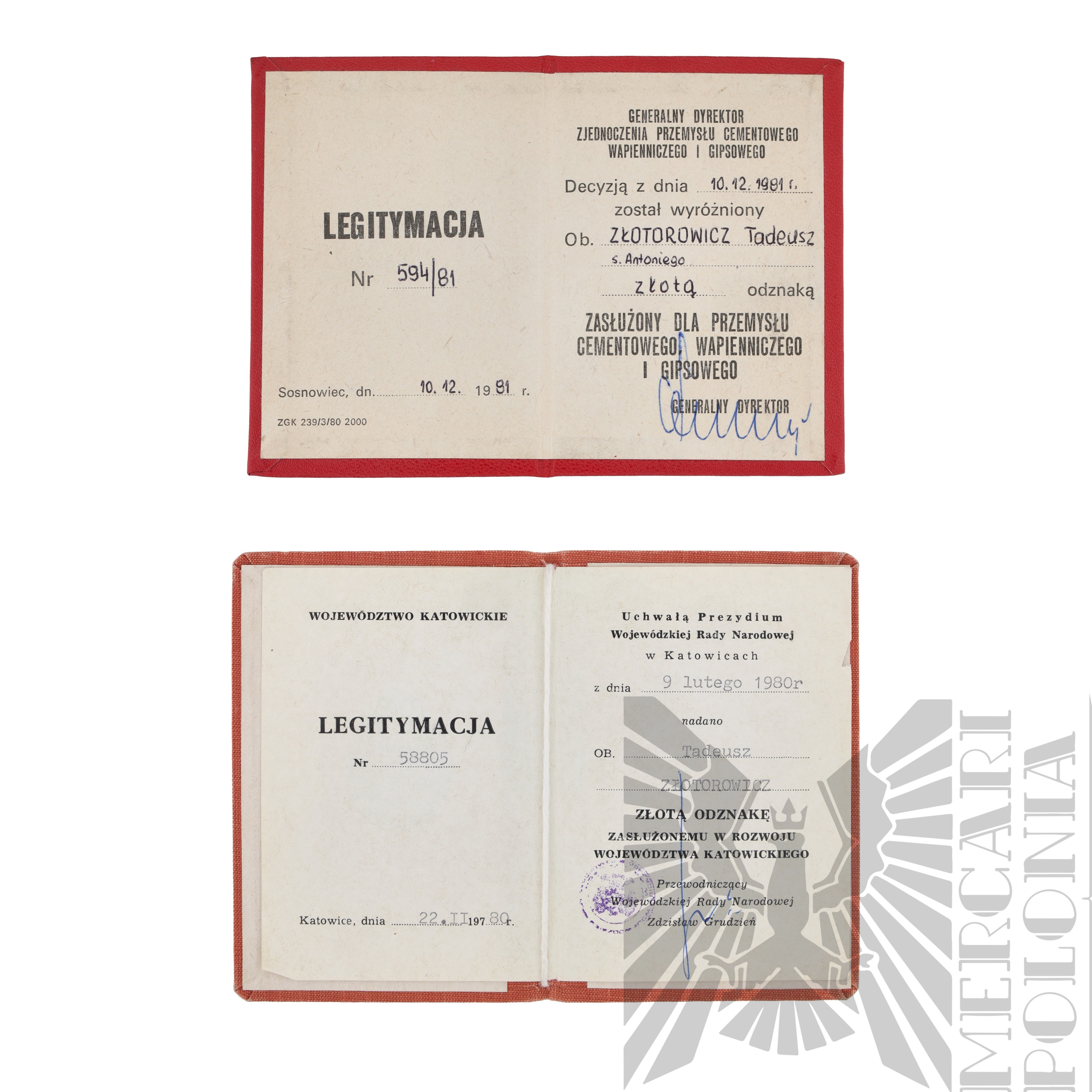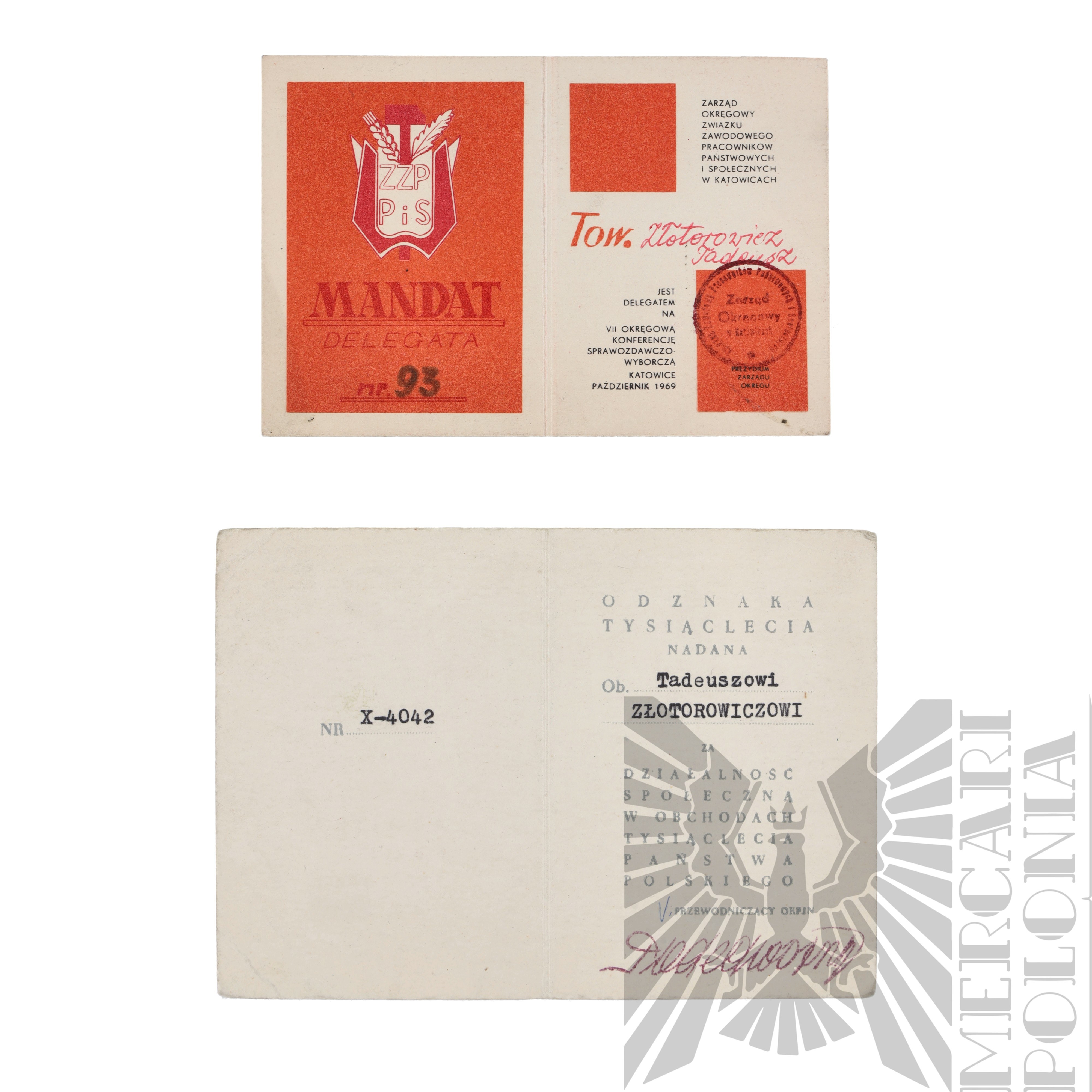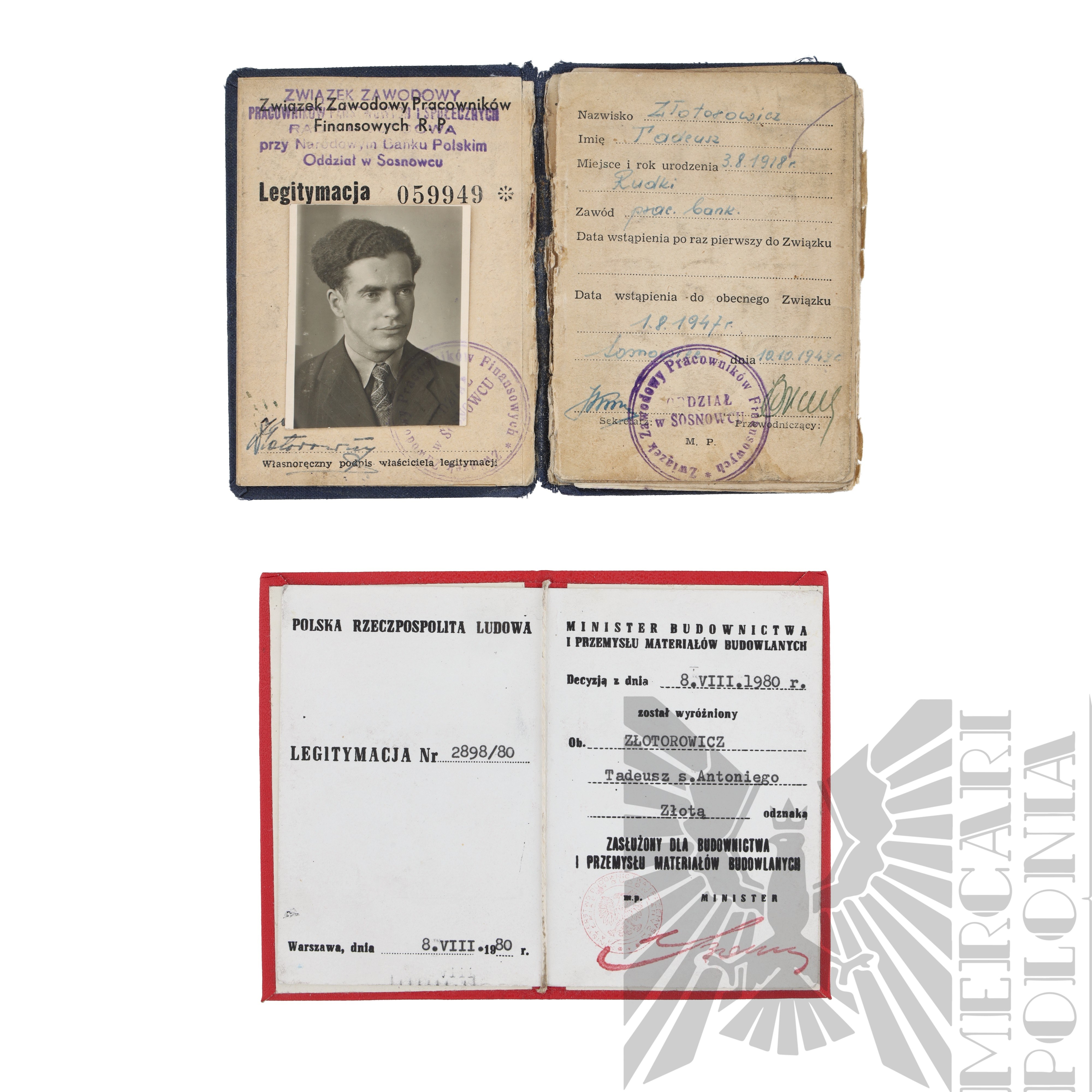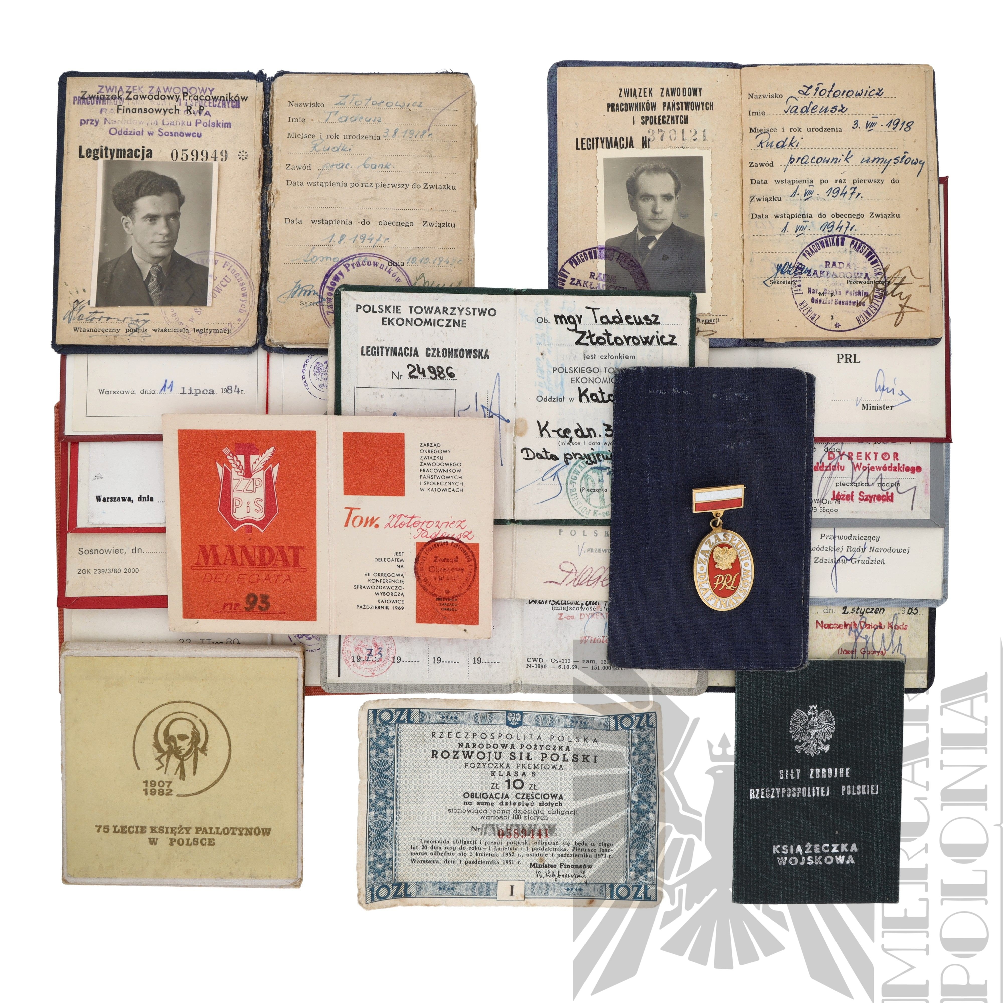 Duży zestaw legitymacji i odznak z okresu Polskiej Rzeczypospolitej Ludowej należących do Tadeusza Złotorowicza, weterana 1 Dywizji Pancernej.