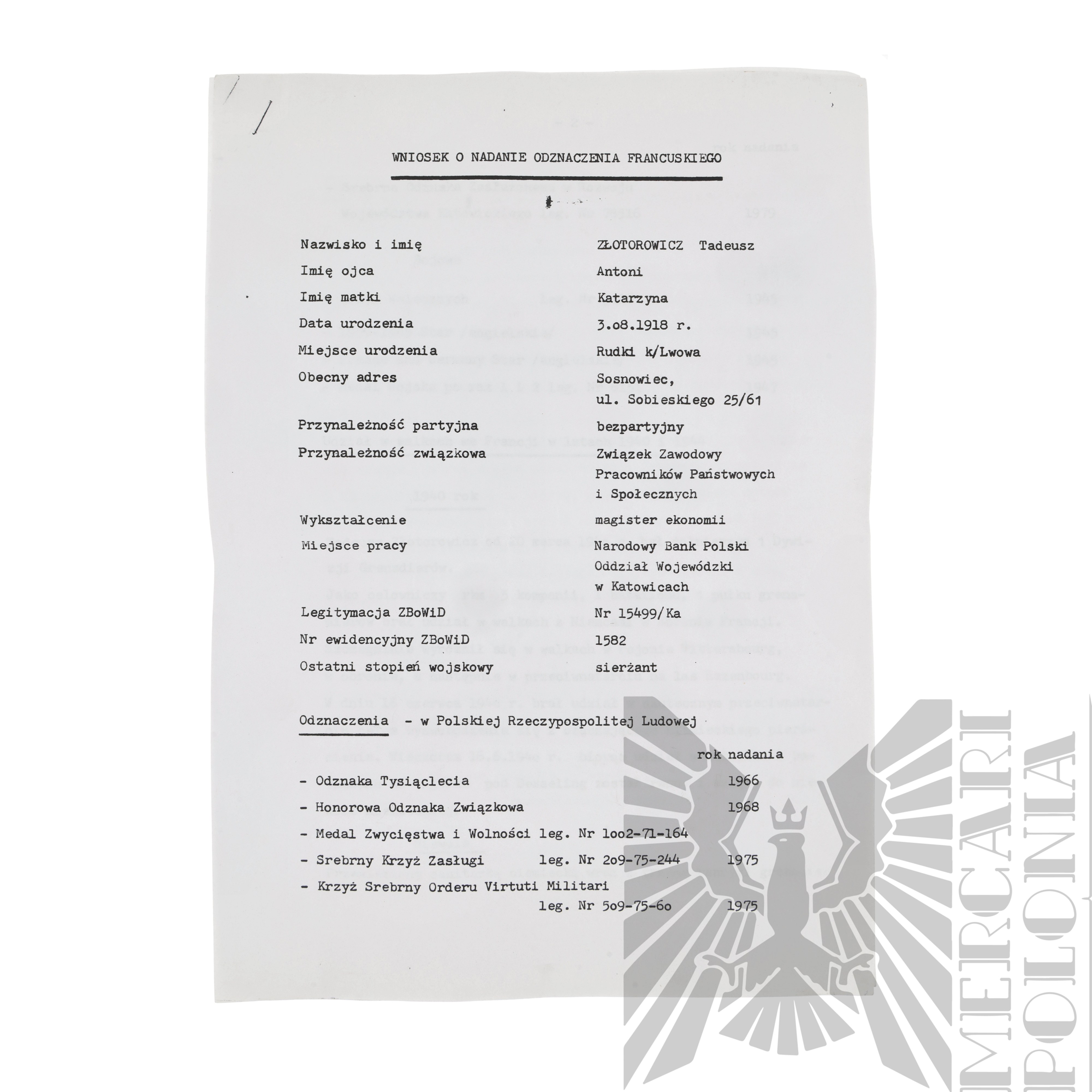 [ZŁOTOROWICZ] PSZnZ/PRL Zestaw Odznaczeń, Wpinek i Legitymacji - Tadeusz Złotorowicz - Kawaler Virtuti Militari