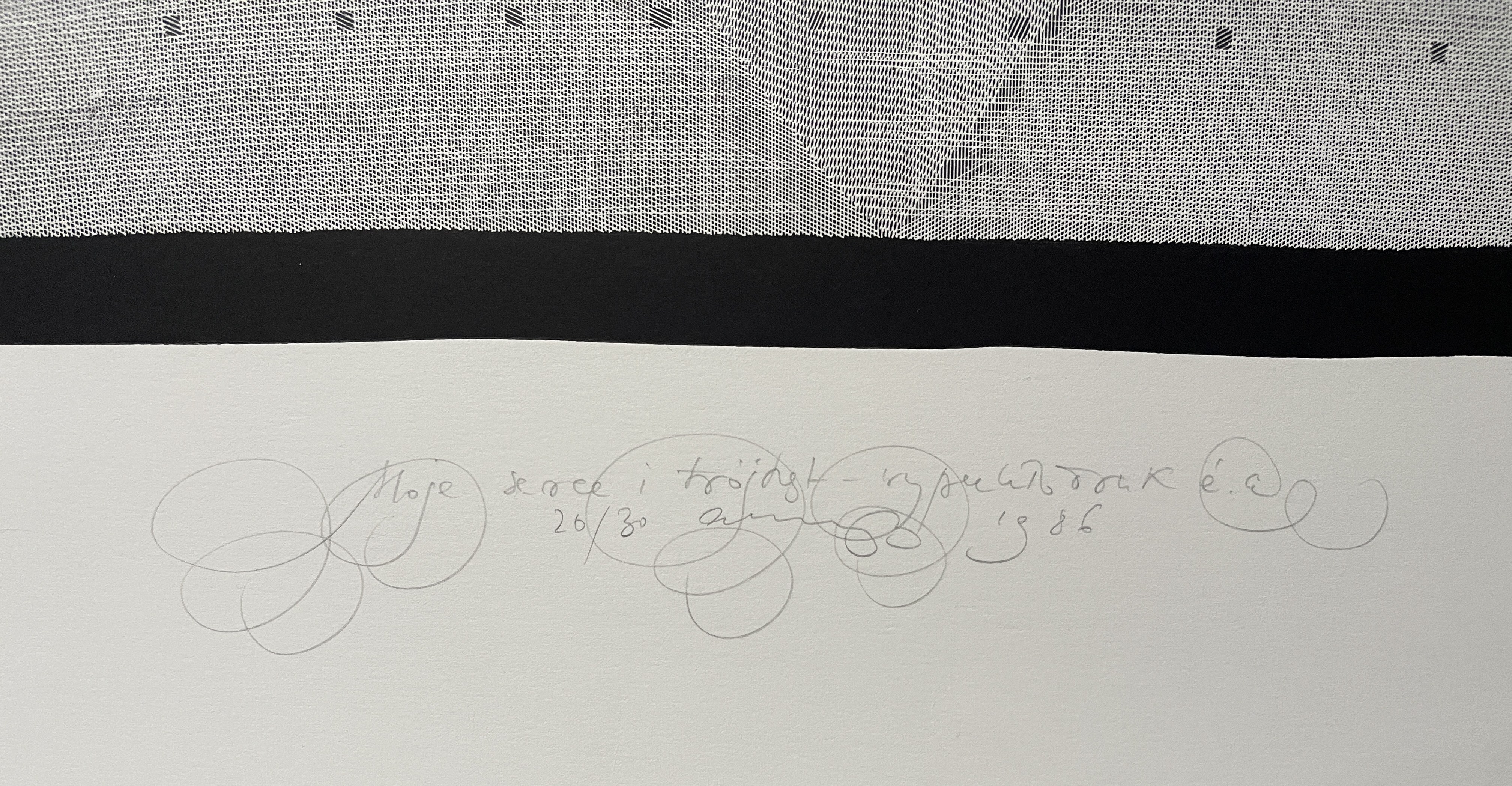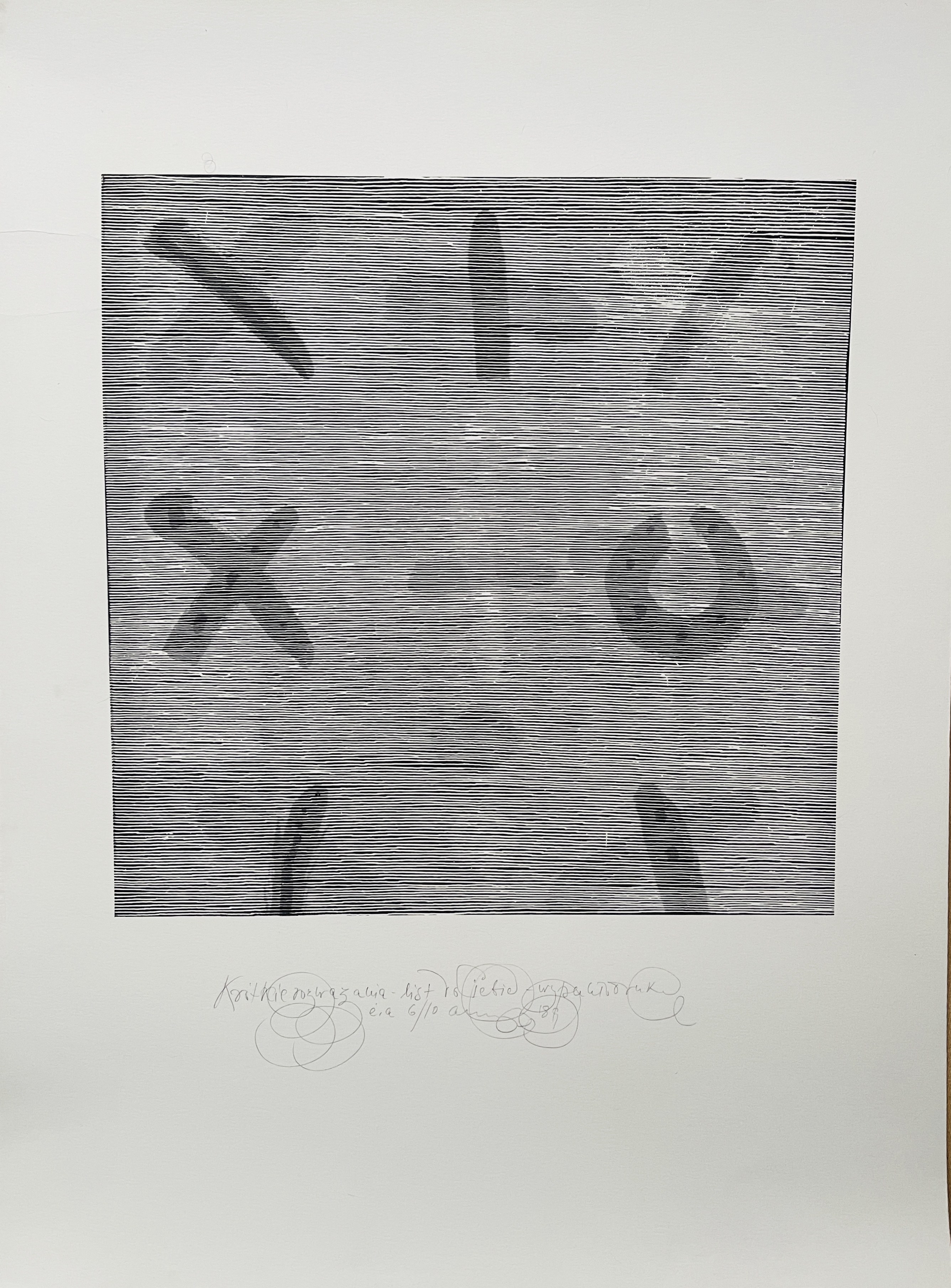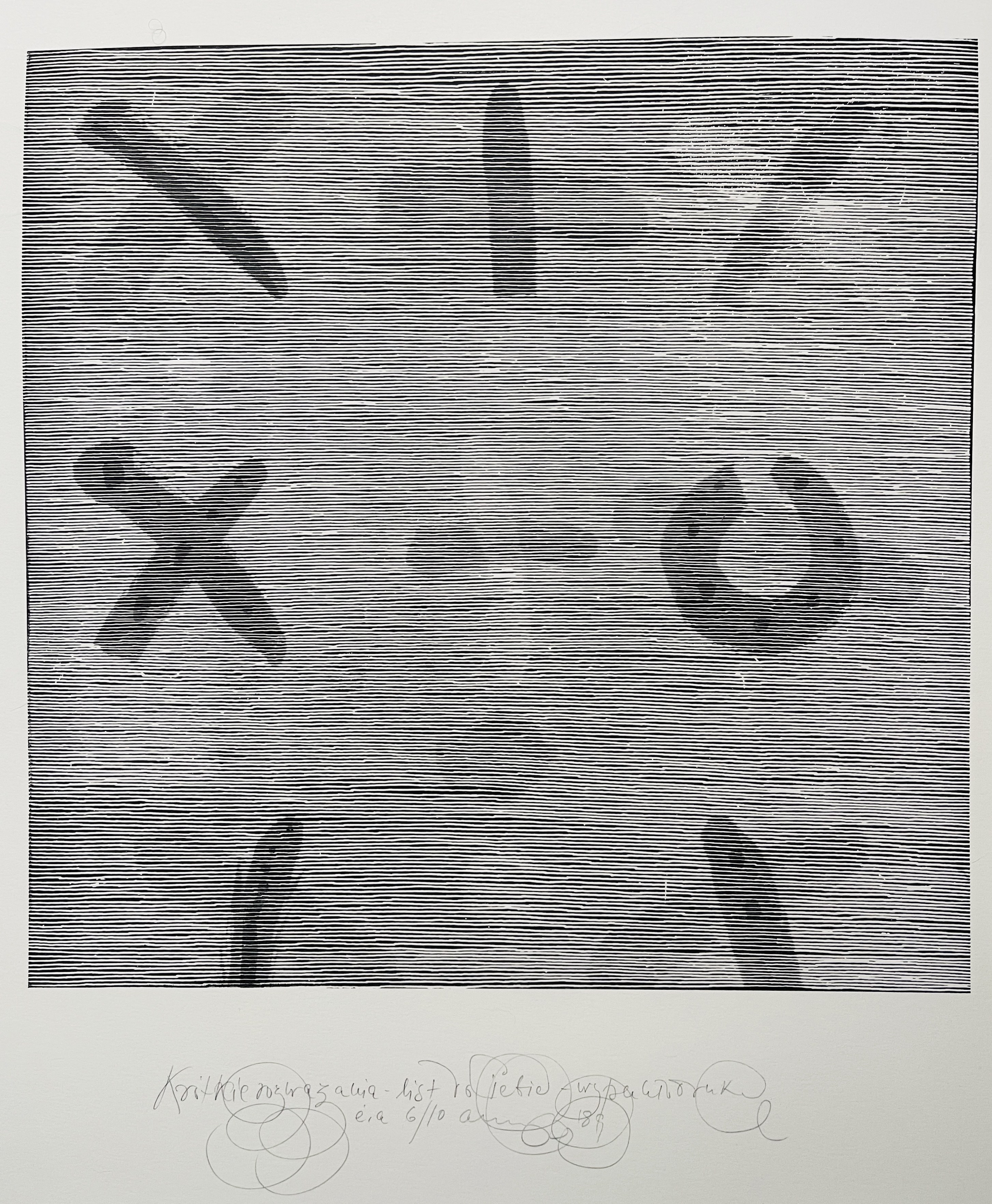 grafika (wypukłodruk; wym. 75 x 56 cm, sygn. i opisany u dołu kompozycji "Krótkie rozwiązania, list do siebie, ; wypukłodruk;e/a; 6/10; A.Smoczyński 89" ołówkiem.