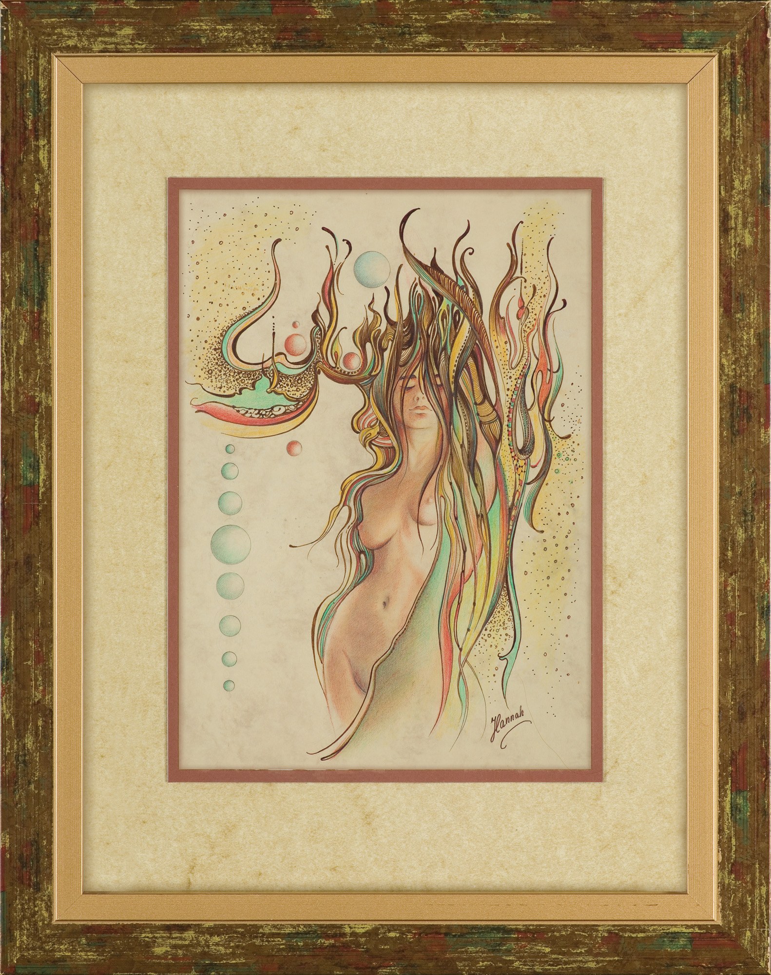 28,2 x 19,8cm - tusze, kredki barwne, ołówek, papier sygn. brązowym tuszem p.d.: Hannah
