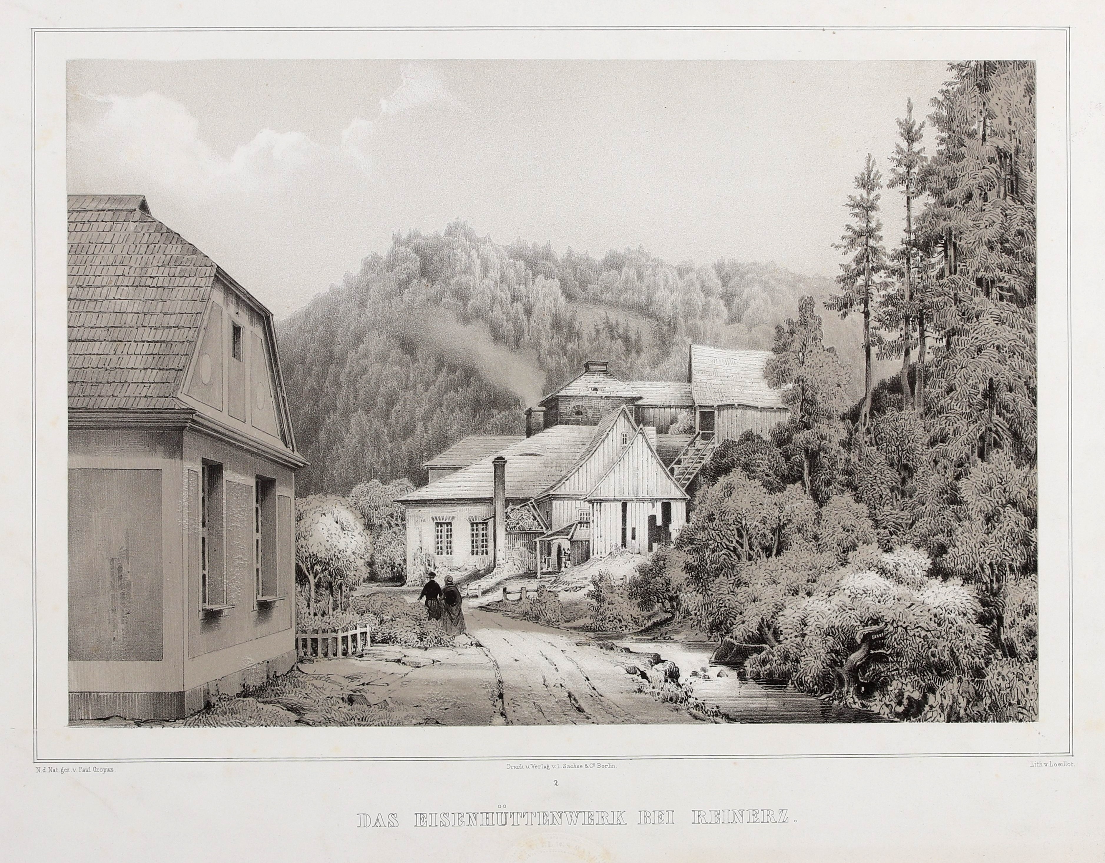 DUSZNIKI ZDRÓJ. Huta żelaza w Dolinie Strążyckiej; rys. z natury P. Gropius, lit. W. Loeillot, ok. 1860; tłoczony znak wyd.; lit. cz.-b., st. bdb., minimalne zagniecenia marginesów; wym. lit. 295x202 mm; DAS EISENHÜTTENWERK BEI REINERZ.