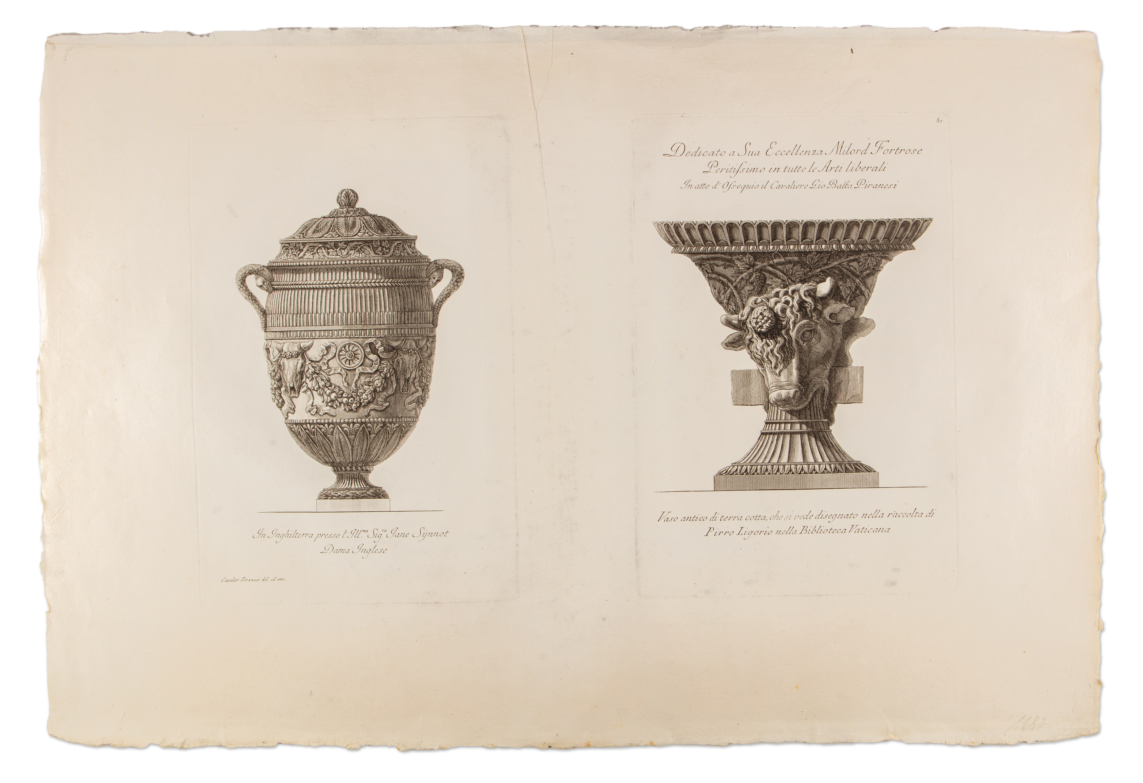 GIOVANNI BATTISTA PIRANESI (ITALY / ITALIAN 1720 - 1778) - Vaso antico di terra cotta, che si vede disegnato nella raccolta di Pirro Logorio nella Biblioteca Vaticana (large sheet)
