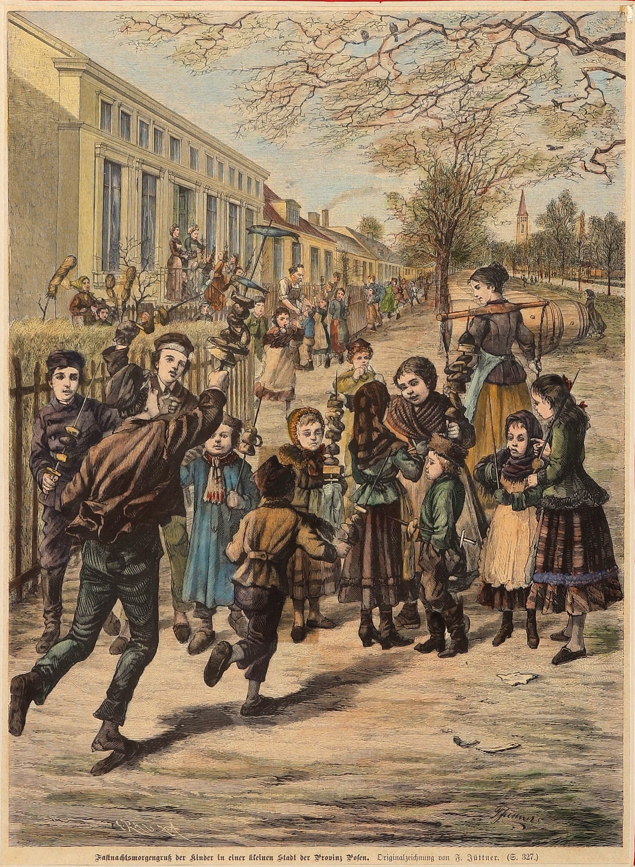 WIELKOPOLSKA. Koniec karnawału – ostatki w małej miejscowości w ówczesnej Prowincji Poznańskiej; rys. F. Jüttner, ryt. E. Rau (?), ok. 1880; drzew. szt. kolor., st. bdb., passe-partout; wym. widoku 237x321 mm; Fastnachtsmorgengruß der Kinder in einer kleinen Stadt der Provinz Posen.