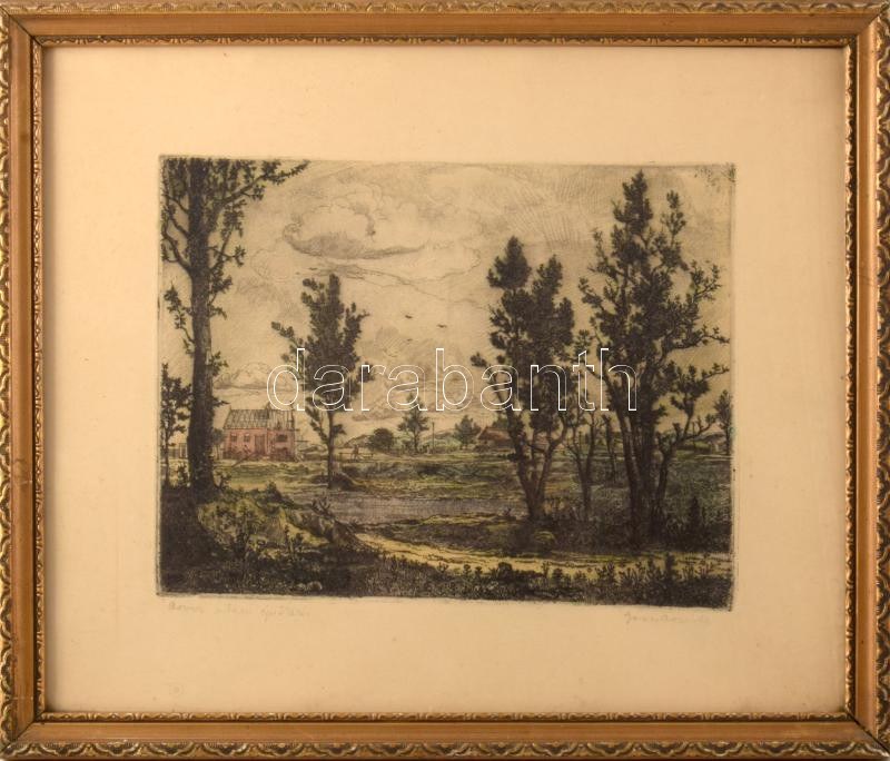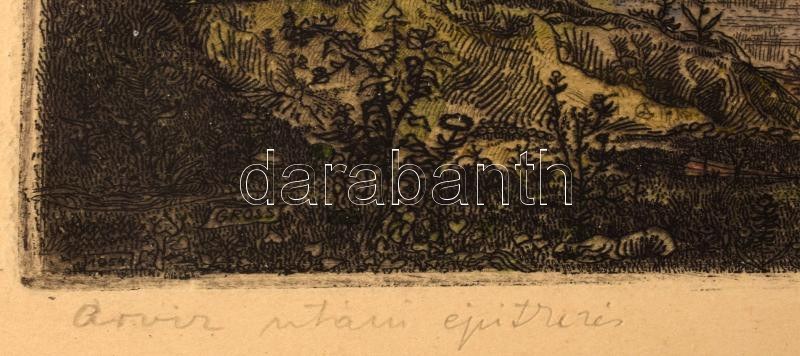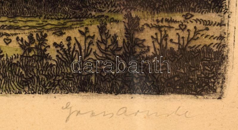 Gross Arnold (1929-2015): Árvíz utáni építkezés. Színezett rézkarc, papír, jelzett. 18,5x24 cm Üvegezett fakeretben...