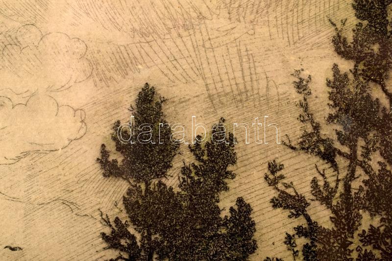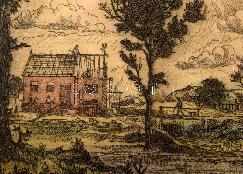 Gross Arnold (1929-2015): Árvíz utáni építkezés. Színezett rézkarc, papír, jelzett. 18,5x24 cm Üvegezett fakeretben.