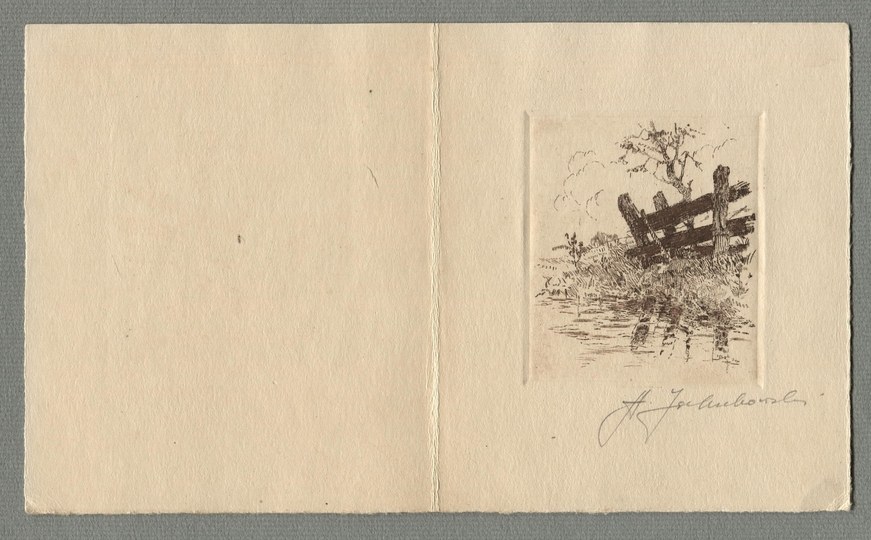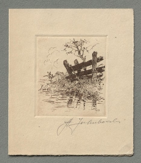 Akwaforta form. 6,9x5,9 na ark. 12,5x21,3 cm. Pod kompozycją z prawej ołówkowa sygnatura artysty "St. Jakubowski". Stan bardzo dobry.