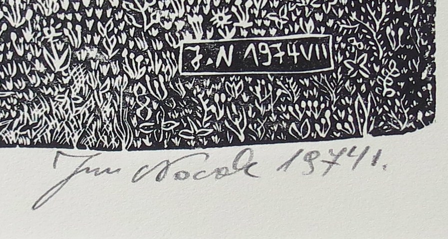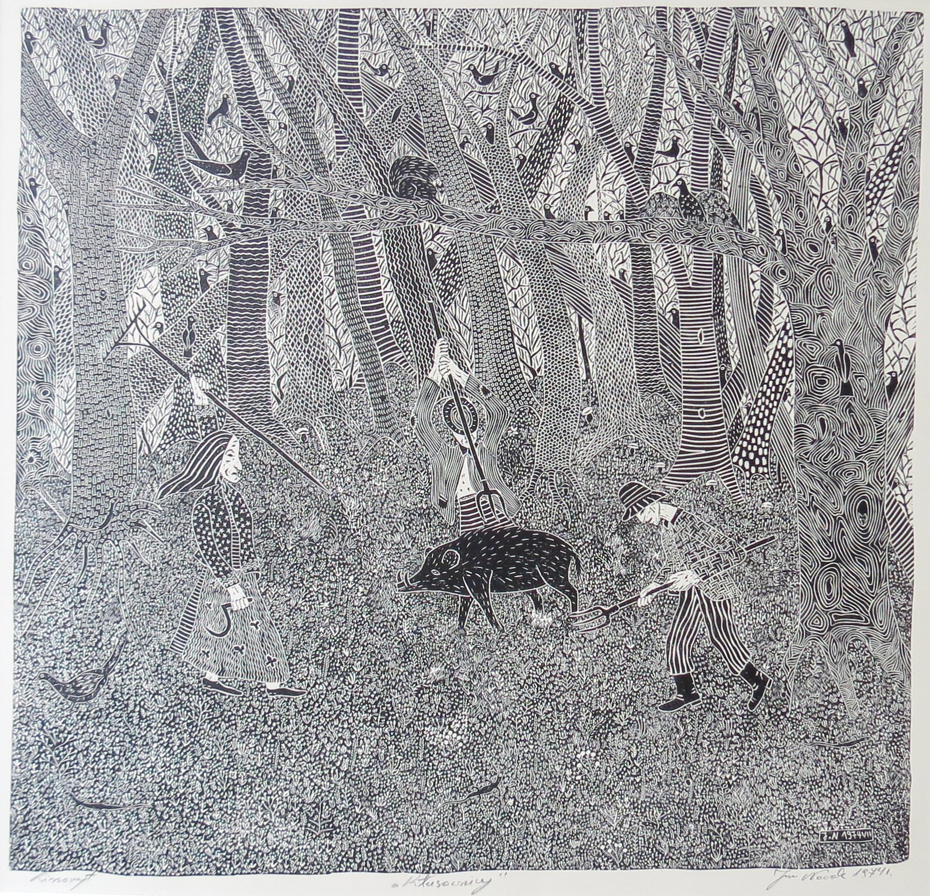 linoryt, odbitka wykonana ręcznie bez użycia prasy graficznej, 54,2 x 56,8 cm, sygn. oł. p.d.: Jan Nowak 1974r.; oł. l.d.: Linoryt "KŁusownicy", monogramem na płycie p.d.: JN 1974 VII