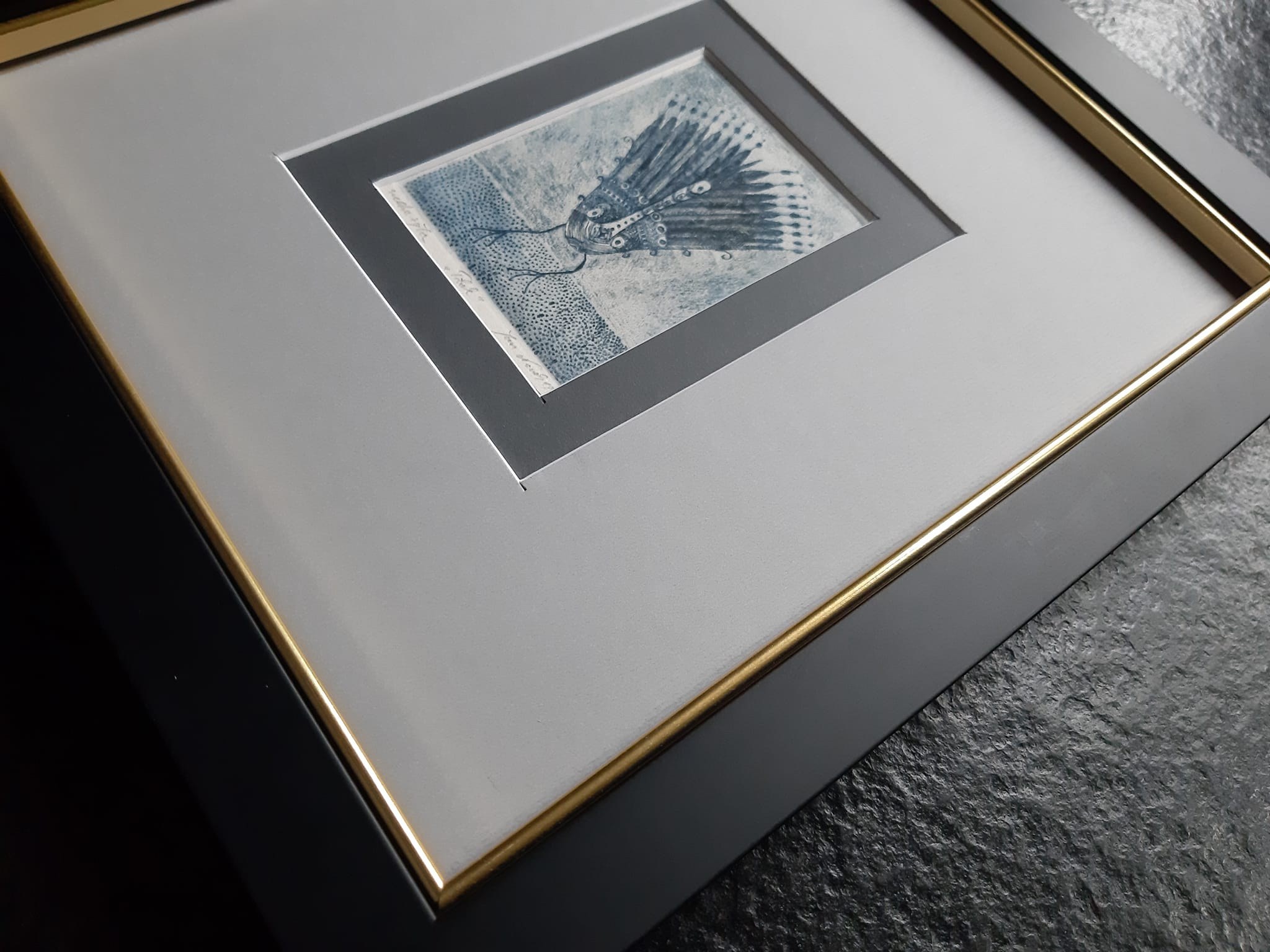 W przepięknej oprawie, czarna ramka ze złotymi dodatkami, podwójne dwukolorowe passe partout, szkło akrylowe